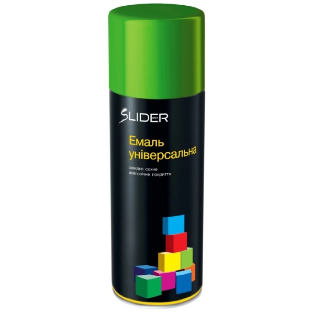 Емаль SLIDER універсальна - універсальна швидковисихаюча аерозольна емаль SLIDER - підходить для фарбування пластикових, дерев'яних та металевих основ. Має стійкість до вицвітання і втрати кольору. Велика палітра кольорів сприяє більш легкому вибору.