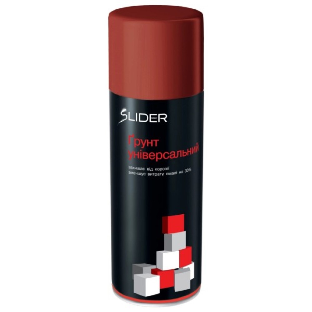 Грунт SLIDER універсальний - використовується для підготовки до фарбування металевих, дерев'яних, бетонних, гіпсокартонних та інших поверхонь. Об'єм балончика 400 мілілітрів. Час сушіння алкідної ґрунтовки «SLIDER» в аерозольній упаковці становить 10-15 хвилин при температурі 15-25 0С. вміст аерозольного балона з алкідною ґрунтовкою, струшуючи його не менше 2-3 хвилин. Провести пробне розпилення ґрунтовки алкідної "SLIDER". Тримати аерозольний балон вертикально.