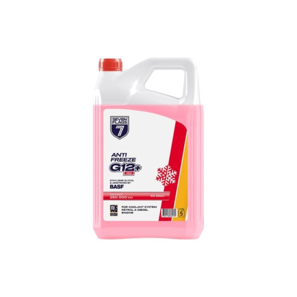 Антифриз 7FLAGS Super G12+ червоний — це інноваційна охолоджуюча рідина, створена для забезпечення максимального захисту та ефективної роботи системи охолодження вашого автомобіля. Завдяки основі на етиленгліколі, цей продукт демонструє відмінні властивості при екстремальних температурних перепадах, гарантуючи температуру замерзання до -25 °C. Його насичений червоний колір слугує відмінним маркером для швидкої ідентифікації та контролю рівня рідини.