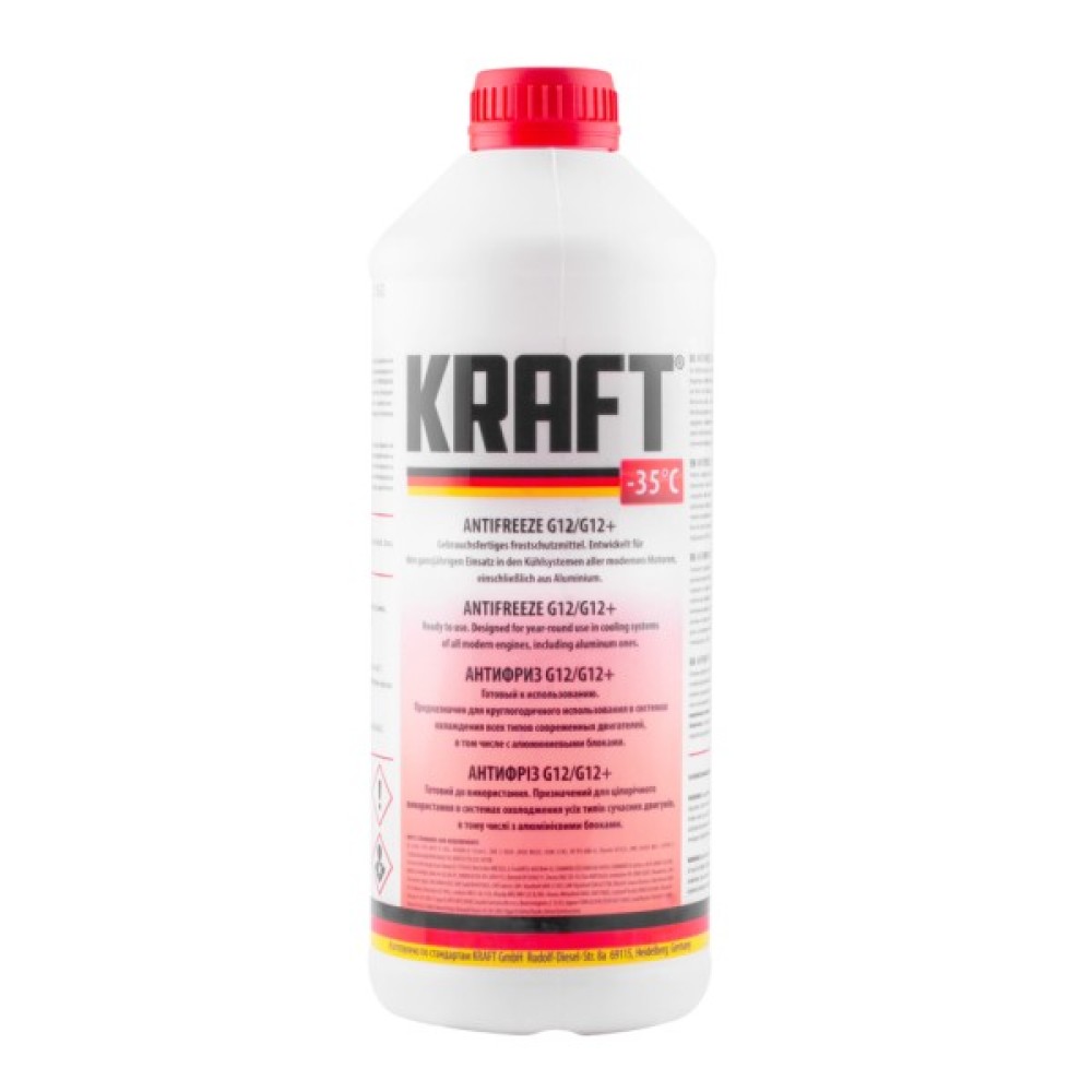 Антифриз KRAFT G12/G12+ -35 (червоний) 1,5л (KF109) — це готове рішення для максимального захисту і ефективності вашого автомобіля. Він належить до класу G12+, забезпечуючи високий рівень захисту системи охолодження автомобілів завдяки своїй моноетиленгліколевій основі з активними інгібіторами корозії. Цей продукт, пофарбований у яскраво-червоний колір, не тільки захищає від іржавіння, але й підходить як для традиційних, так і для сучасних автомобілів, автобусів, мотоциклів та спеціальної техніки.