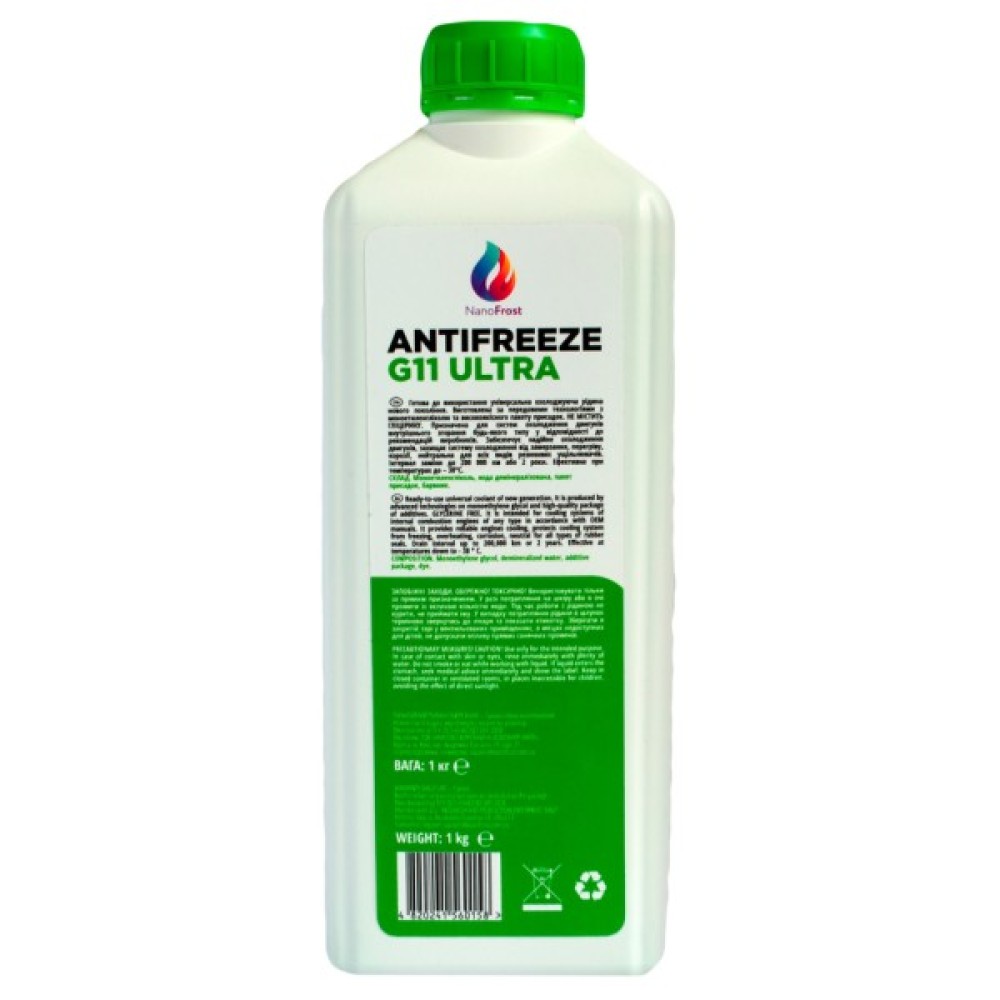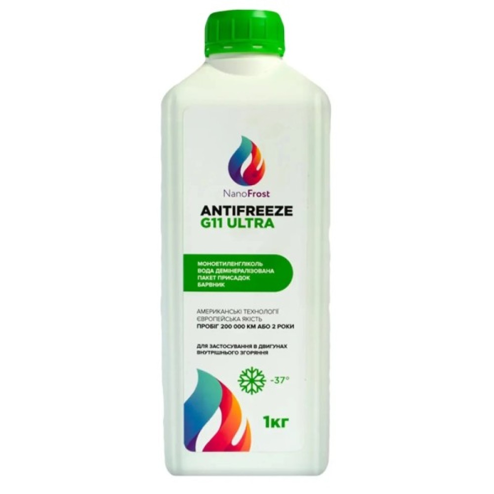 Антифриз NanoFrost G11 ULTRA зелений, 1 кг — це преміум охолоджувальна рідина, що поєднує передові технології та безперечну якість. Розроблений на основі моноетиленгліколю, він класу G11, не містить фосфатів, амінів та нітратів, що робить його екологічним вибором для двигунів легкових і вантажних автомобілів. Продукт забезпечує чудовий антикорозійний захист для чавунних та алюмінієвих деталей, зберігаючи їхню цілісність та оптимальну продуктивність.