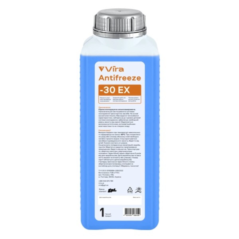Її температура замерзання до -30 °C та початок кристалізації при -27 °C засвідчують здатність витримувати екстремальні холодні умови. Блакитний колір забезпечує зручність у контролі рівня рідини в системі. Антифриз VIRA ЕХ відповідає класифікації G11, що гарантує сумісність з найвищими стандартами якості.