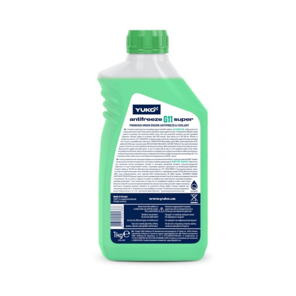 Антифриз Yuko -32 Super G11 зеленого кольору, об'ємом 1 літр (4823110404386), є високоякісним охолоджуючим засобом, розробленим для надійного захисту сучасних бензинових і дизельних двигунів, у тому числі з легких металів. На основі моноетиленгліколю та спеціальних антикорозійних добавок BASF, цей антифриз забезпечує довговічний захист металевих компонентів з чавуну, алюмінію, міді та сталі.