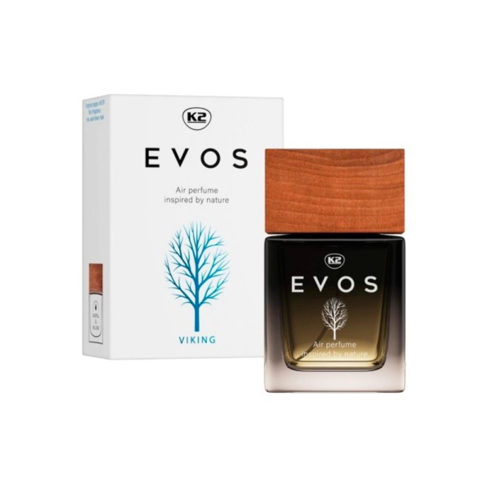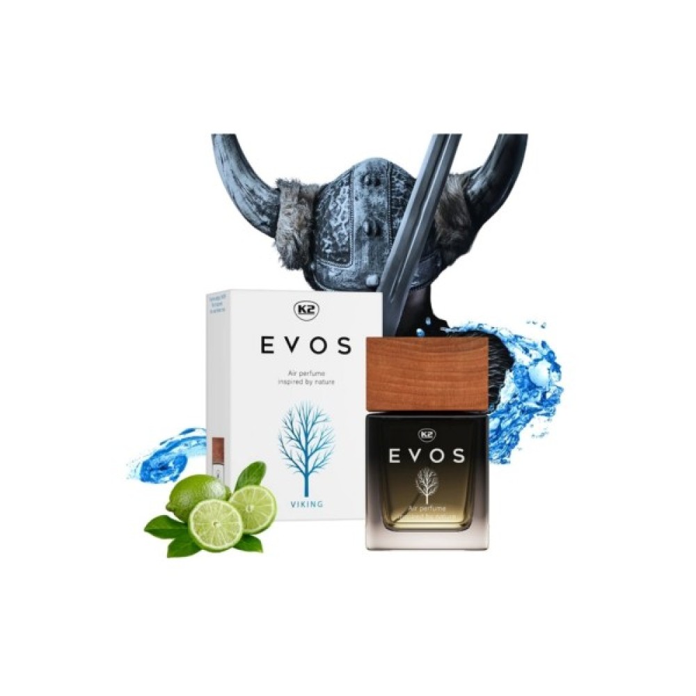 Автомобільні парфуми Evos ― чудовий спосіб продовжити термін служби дерев'яної підвіски для запахів K2 Evos. Підвіска знову наповнюється благородним ароматом, який поступово виділяється в салон автомобіля. Пробудіть свій дух воїна. Це поєднання контрастних нот аромату лайма і мускусу — в них ви впізнаєте людину з неординарним характером, а також в ароматі водяних квітів, що демонструє тонкість його натури. Дозвольте хвилям освіження віднести вас у незабутню подорож до воріт запашної Вальгалли.