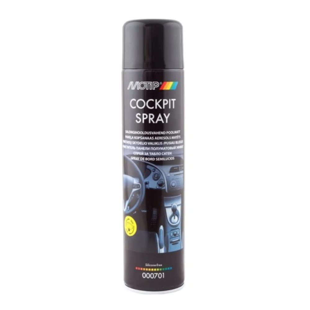 Очищувач панелі напівматовий ефект COCKPITSPRAY SEMI GLOSS - це традиційний аерозольний очищувач поліроль для торпедо та інших пластикових елементів оздоблення салону автомобіля. Препарат не має ніякого особливого вираженого запаху, залишає поверхню помірно блискучою, надає їй брудо- і пиловідштовхуючі властивості.