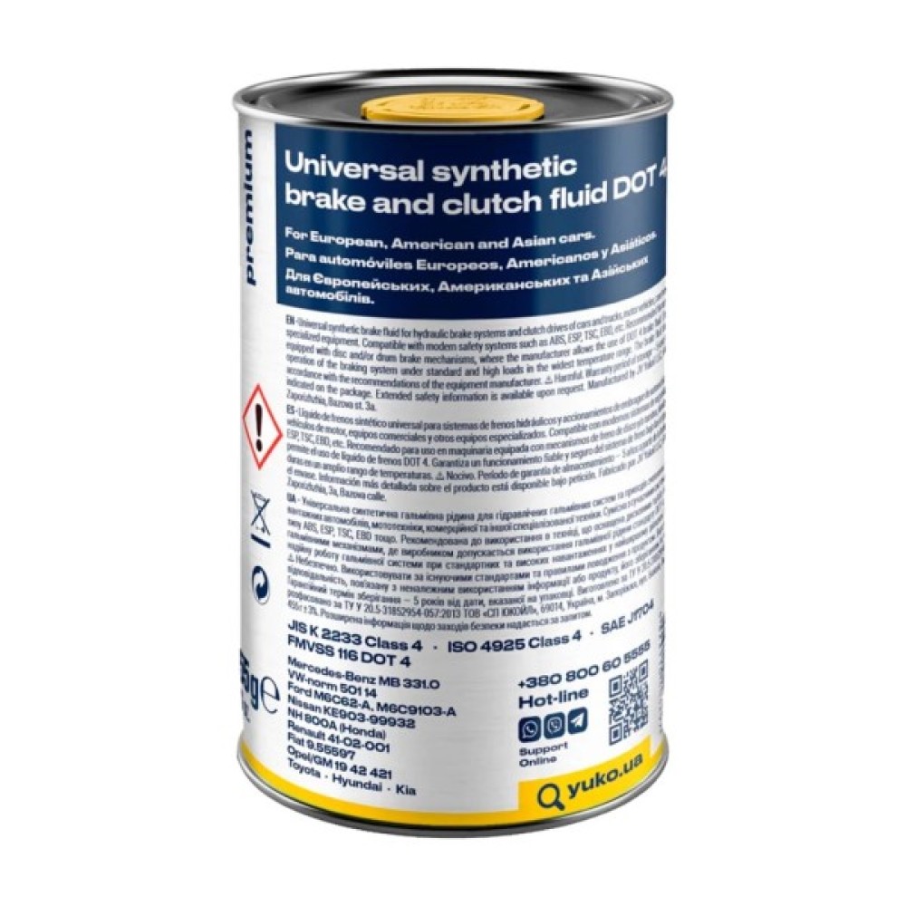 Універсальна синтетична гальмівна рідина Yuko ДОТ-4 для гідравлічних гальмівних систем та приводів зчеплення легкових та вантажних автомобілів, мототехніки, комерційної та іншої спеціалізованої техніки. Сумісна з сучасними системами безпеки типу ABS, ESP, TSC, EBD тощо. Рекомендована до використання в техніці, що оснащена дисковими та/або барабанними гальмівними механізмами, де виробником допускається використання гальмівної рідини стандарту DOT 4. Забезпечує надійну роботу гальмівної системи при стандартних та високих навантаженнях у найширшому діапазоні температур.