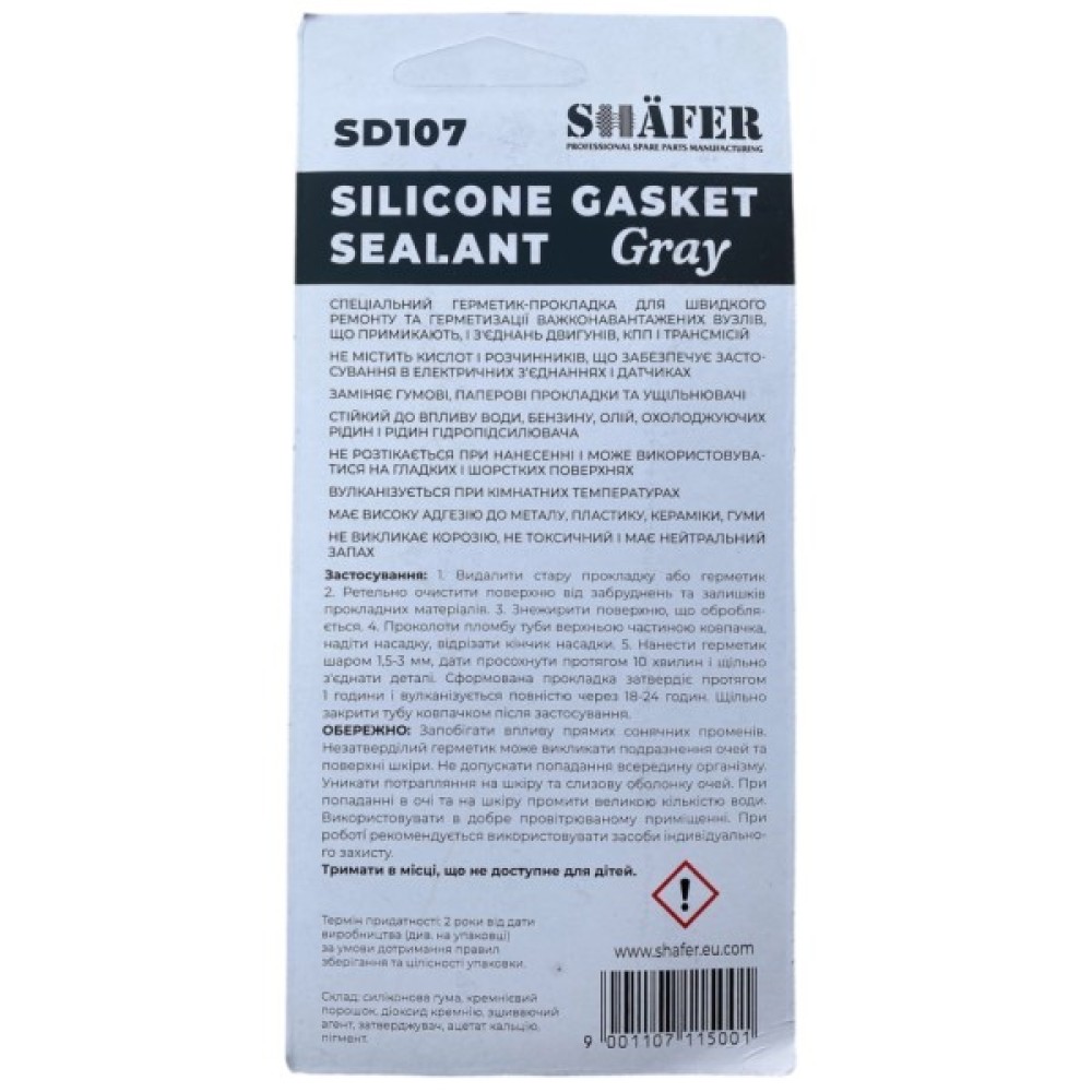 SHAFER SD107 – це герметик, що затверджується при кімнатній температурі. Винятково стійкий до дії екстремальних температур. Створює надійне ущільнення, яке не тріскається, не стискується та не зсувається під впливом різких перепадів температур. Замінює кільця ущільнювачів, шайби, а також азбестові, гумові, повстяні, паперові, пробкові та металеві ущільнення.