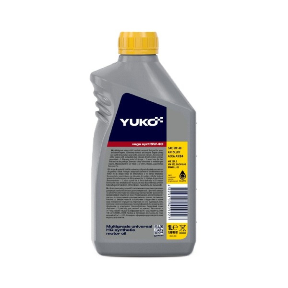 Моторна олива Yuko VEGA SYNT 5W-40 API SL/CF 1л (4823110401927) - високоякісна синтетична олива, розроблена для надійного захисту та покращення роботи бензинових і дизельних двигунів. Завдяки її всесезонним властивостям, вона здатна ефективно функціонувати в широкому температурному діапазоні, що робить її ідеальним вибором для помірної кліматичної зони.