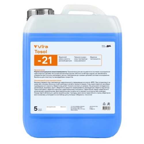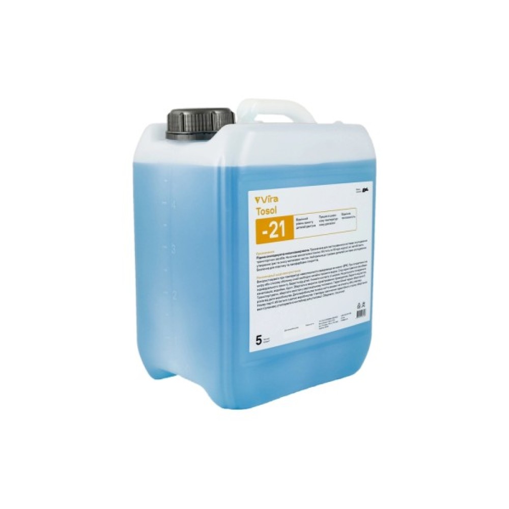 Охолоджуюча рідина VIRA Tosol -21 °С призначена для системи охолодження двигуна внутрішнього згоряння транспортного засобу або автономного обладнання. До складу входять спеціальні антикорозійні інгібітори та компоненти, що забезпечують засобу сумісність із металом, гумою та пластиком.