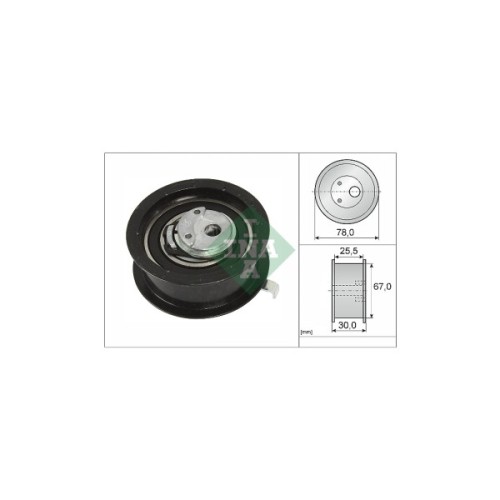 Натяжний ролик зубчастого ременя (ГРМ) INA 531 0251 30 дозволить зробити заміну зношеної/зламаної деталі, поліпшити ступінь натягу ременя, а також стабільність роботи приводу ГРМ та двигуна автомобіля. Всі деталі ролика виконані з матеріалів, високої якості, що дозволить забезпечити тривалий термін експлуатації деталі. Зовнішній діаметр становить 67 мм. Деталь має висоту 25.5 мм.