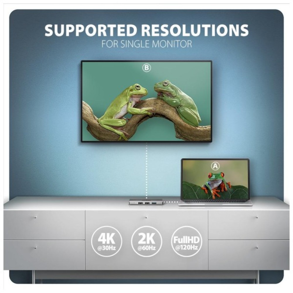 HDMI-вихід підтримує зображення до 4K при 30 Гц, 2K при 60 Гц або FullHD при 120 Гц. Це дає змогу комфортно працювати з відео, презентаціями або грати на великому екрані. Передається також багатоканальний звук — до 8 аудіоканалів у форматі LPCM, AC-3 чи DTS. Для роботи відео необхідний порт USB-C із підтримкою DisplayPort Alternate Mode або Thunderbolt 3/4.