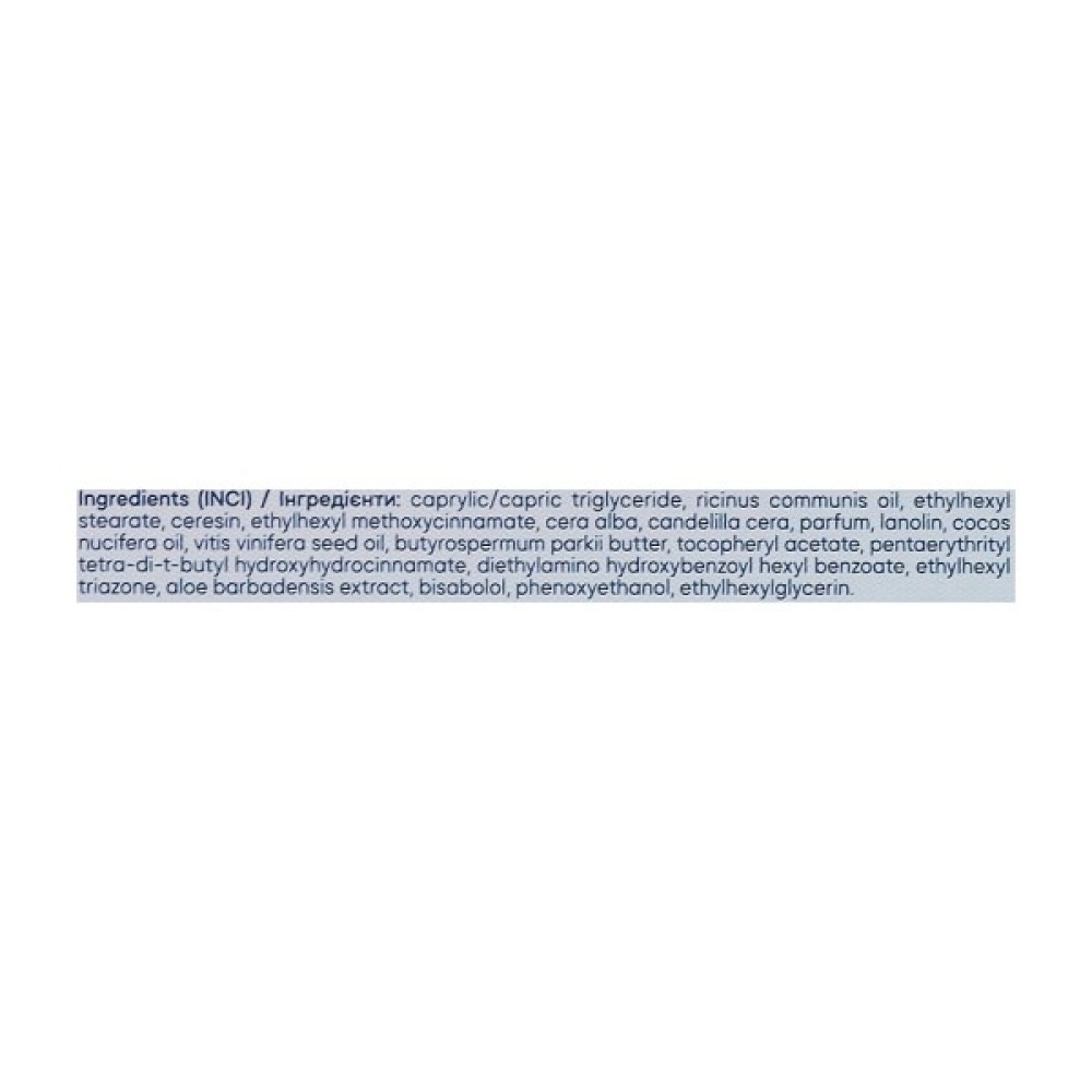 caprylic/capric triglyceride, ricinus communis oil, ethylhexyl stearate, ceresin, ethylhexyl methoxycinnamate, cera alba, candelilla cera, parfum, lanolin, cocos nucifera oil, vitis vinifera seed oil, butyrospermum parkii butter, tocopheryl acetate, pentaerythrityl tetra-di-t-butyl hydroxyhydrocinnamate, diethylamino hydroxybenzoyl hexyl benzoate, ethylhexyl triazone, aloe barbadensis extract, bisabolol, phenoxyethanol, ethylhexylglycerin