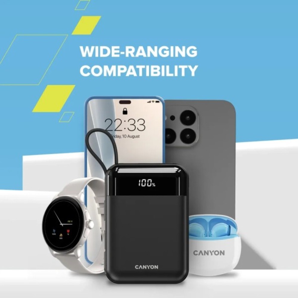 Батарея універсальна Canyon 10000mAh OnPower 104 PD/20W, QC/22.5W built-in cable Black (CNS-CPB104B)