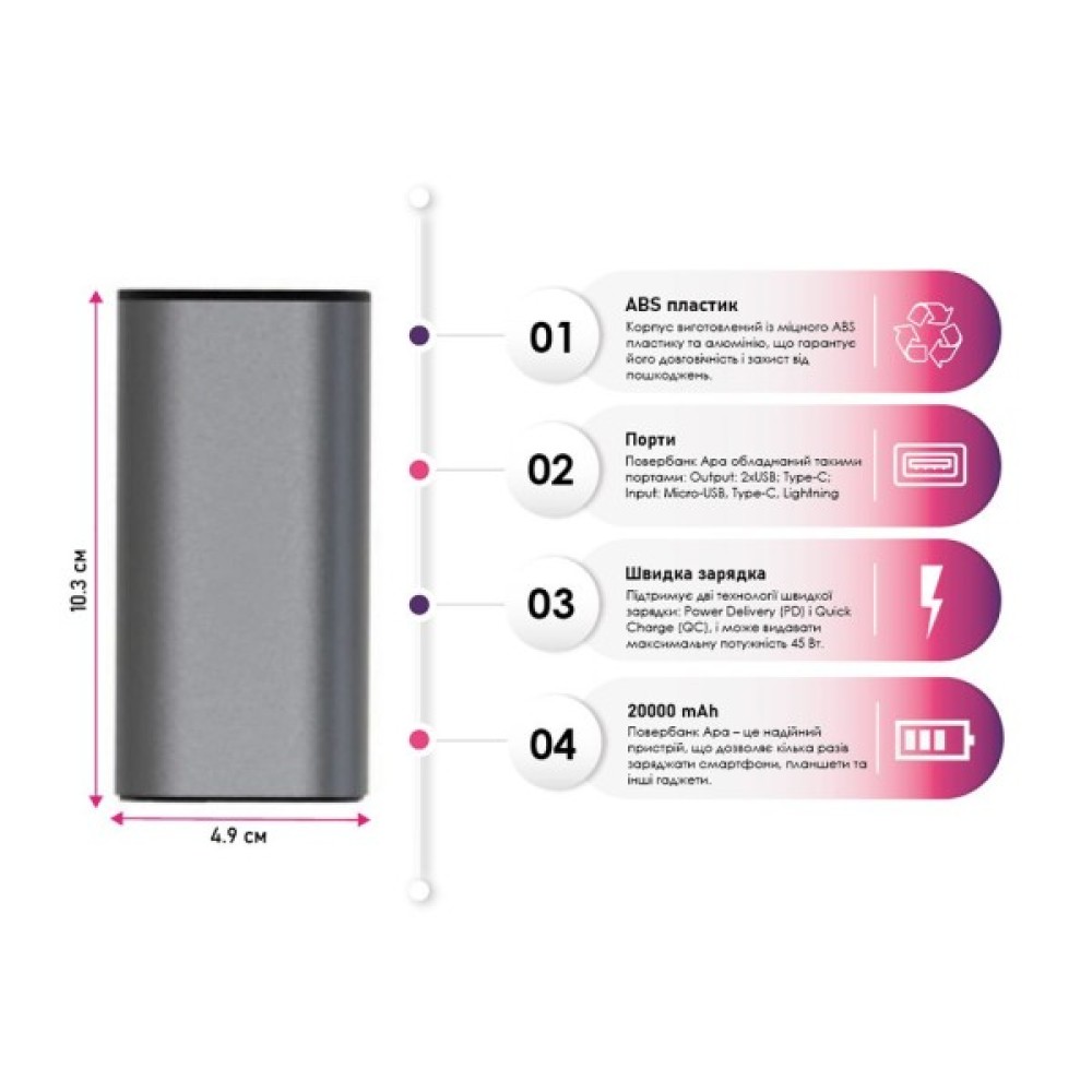 Незважаючи на високу ємність, розміри 49x49x103 мм роблять його зручним для перенесення, тому він легко поміститься у сумці або рюкзаку, забезпечуючи заряд у будь-який момент.
