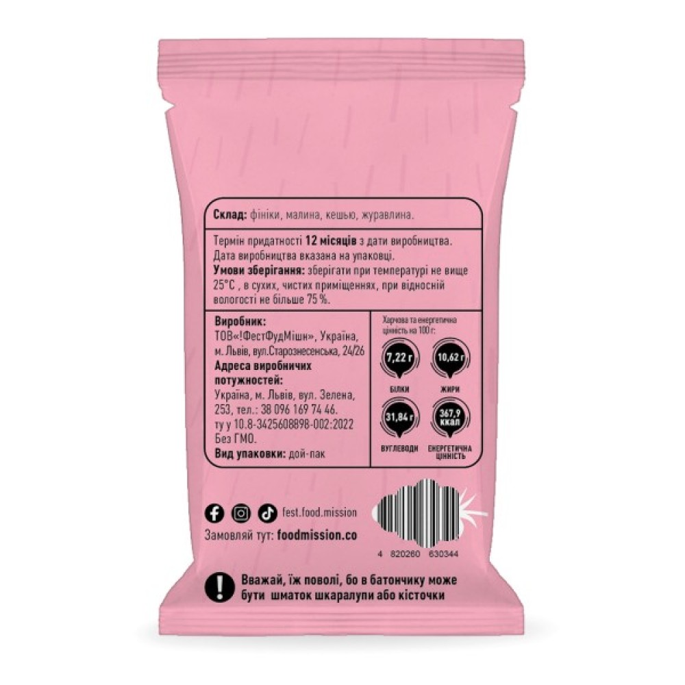 Батончик Food Mission малиновий з горіхами кеш'ю - це смачний та корисний перекус, створений на основі натуральних рослинних компонентів. До його складу входять фініки, малина, кеш'ю та журавлина, що забезпечує гармонійне поєднання солодкого та кислуватого смаку. Продукт не містить цукру, цукрозамінників та глютену, що робить його ідеальним для щоденного вживання всією сім'єю.
