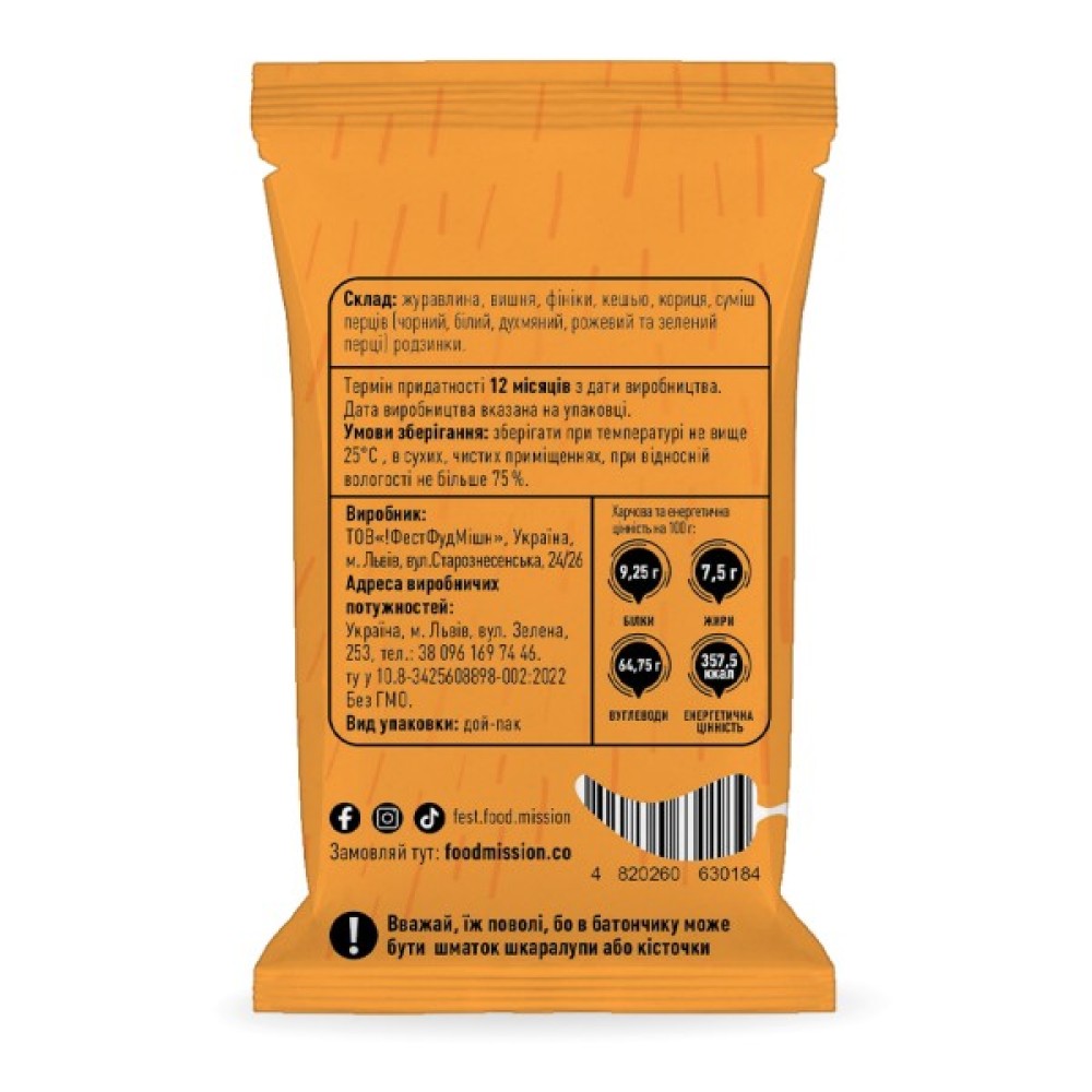 Батончик пряний Food Mission - це ароматний та корисний перекус, створений на основі натуральних інгредієнтів для поціновувачів насиченого смаку з приємними пряними нотками. Його склад збагачений поживними речовинами, що надають енергію та відчуття ситості на тривалий час.