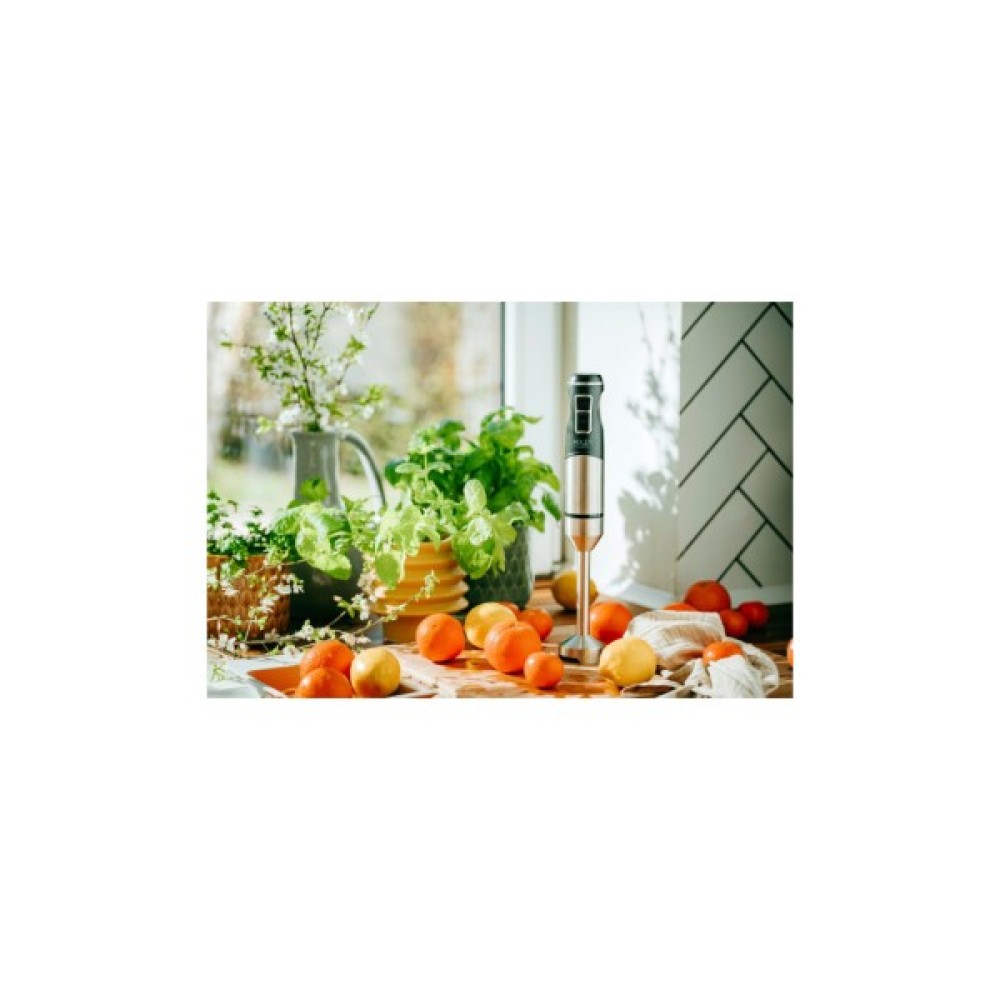 Дизайн блендера передбачає наявність насадки-блендера, що робить його надзвичайно зручним у використанні. Довжина шнура живлення в 1,0 м забезпечує свободу переміщення при роботі, а компактний розмір дозволяє легко зберігати та транспортувати пристрій.