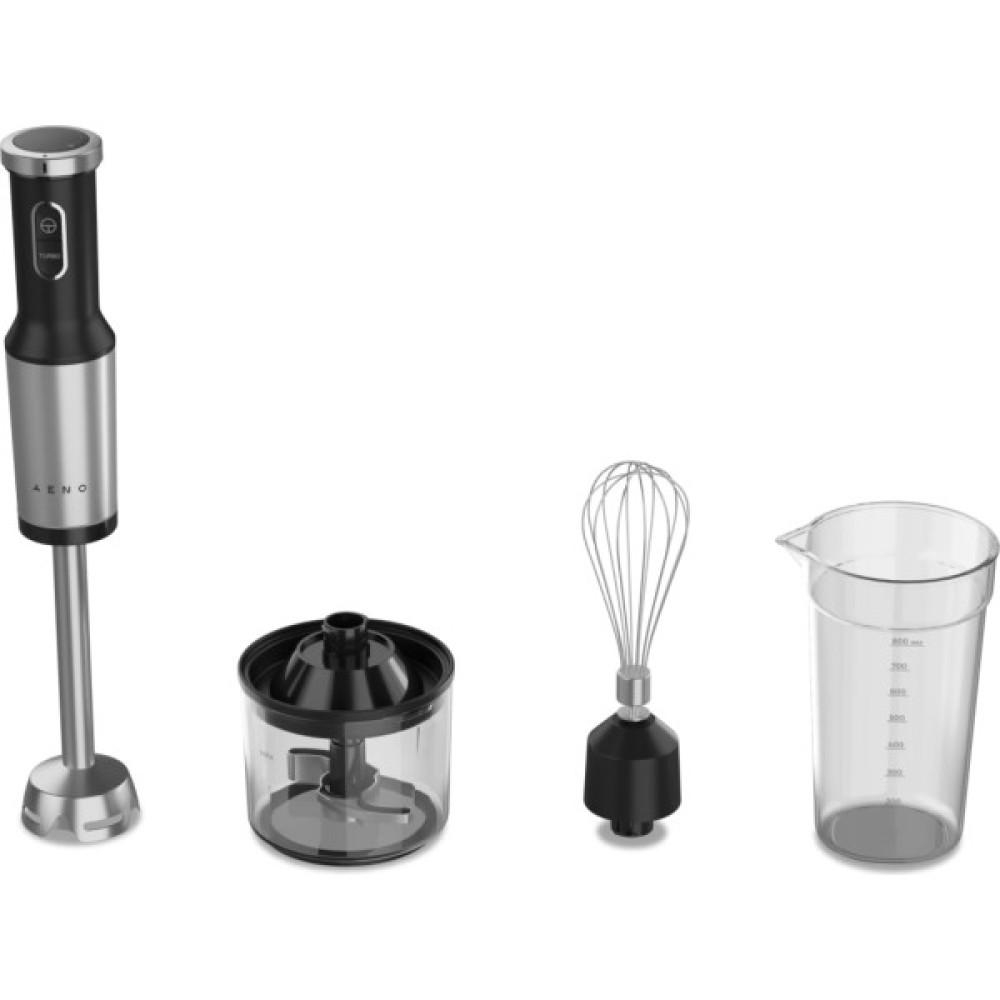 Універсальні можливості та зручність використанняБлендер AENO HB4B пропонує 25 швидкостей, що дозволяє точно підібрати оптимальний режим для кожного інгредієнта. Це робить його ідеальним для приготування різноманітних страв, від ніжних пюре до густих соусів. Занурювальна частина виготовлена з металу, що гарантує довговічність та стійкість до зношування. У комплекті з блендером йдуть віночок, мірна чаша об'ємом 0,8 літра та подрібнювач на 0,5 літра, що розширює можливості його використання.