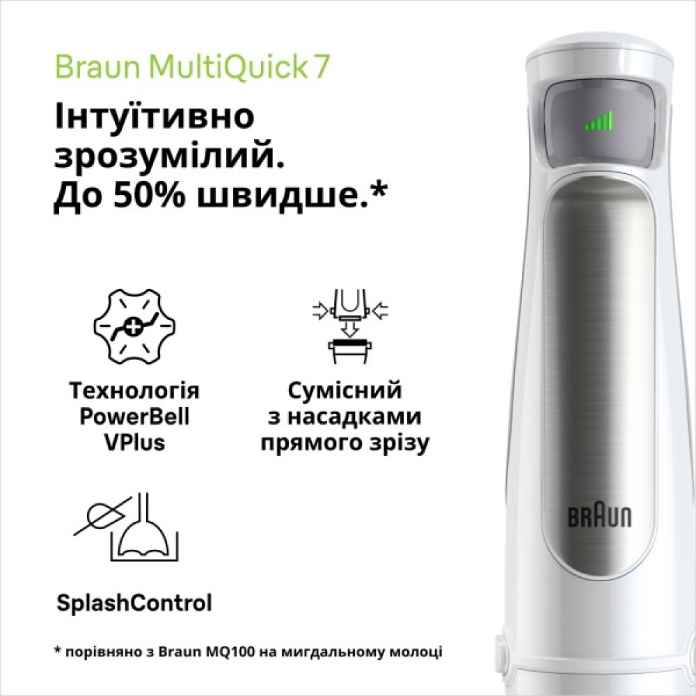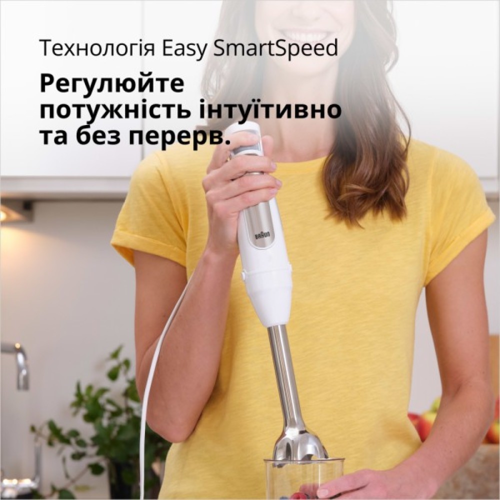 Ергономічний дизайн та матеріали. Корпус Braun MQ 7035 WH виготовлений з якісного пластику, який забезпечує легкість приладу, адже вага складає всього 0.86 кг. Металева ніжка блендера гарантує довговічність і надійність у використанні. Особлива увага приділена зручності управління: система SmartSpeed дозволяє легко регулювати швидкість за допомогою сили натиску на кнопку. Більше не потрібно зупиняти процес для зміни режиму, просто натисніть сильніше для більш інтенсивного змішування.