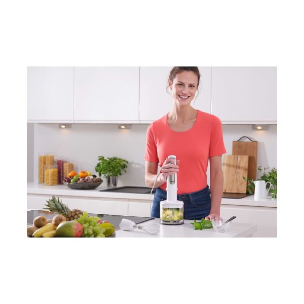 Функціональні можливості. Основою ефективності та багатозадачності цього блендера є комплект насадок. Виріб включає насадку-блендер, насадку-вінчик, ніж для подрібнення та спеціальну насадку для колки льоду. Це дозволяє використовувати його для виконання численних завдань: від збивання вершків або яєчних білків до створення ідеально подрібнених сумішей або льоду для коктейлів. Крім того, елементи легко фіксуються на основі завдяки системі EasyClick Plus.