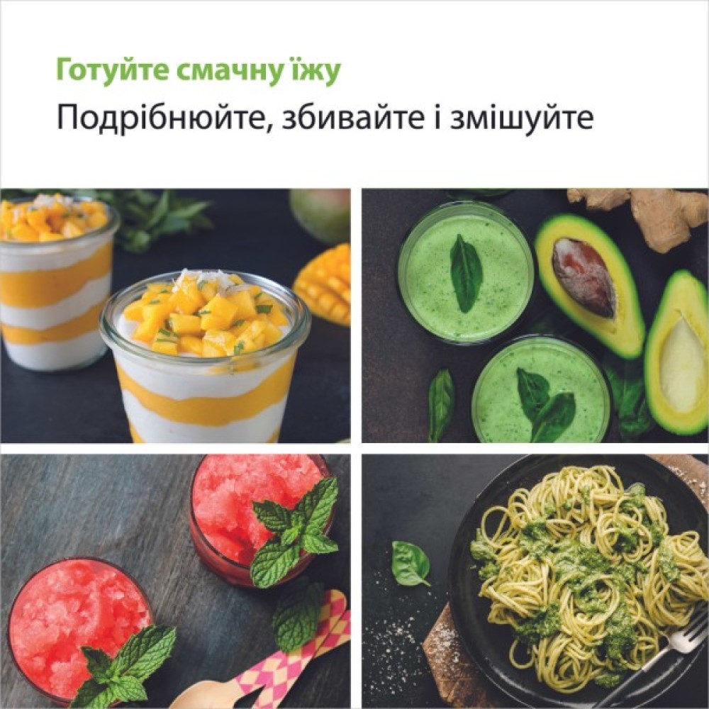 Додаткові аксесуари, такі як мірний стакан об'ємом 0.6 л та чопер, дозволяють ще більше розширити ваші кулінарні горизонти, забезпечуючи зручність і точність у приготуванні.