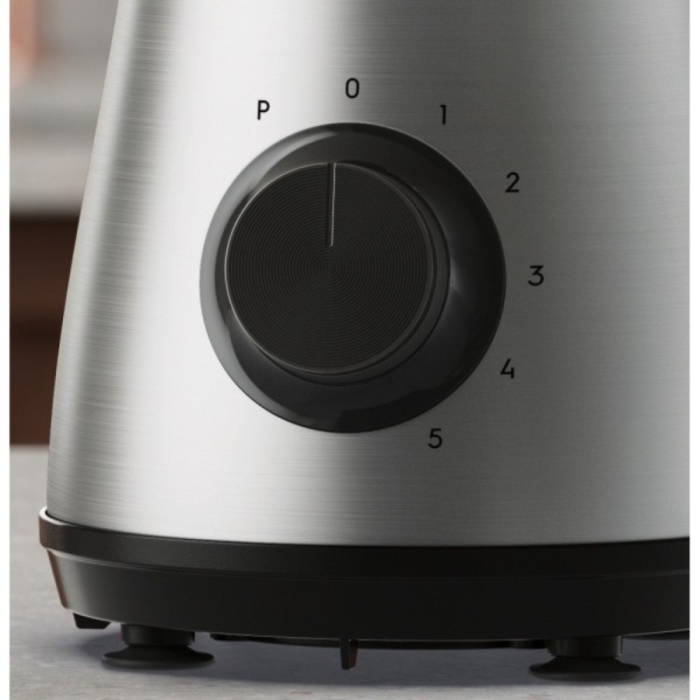 Привабливий та стильний дизайн цього стаціонарного блендера, виконаного з поєднання пластику та нержавіючої сталі, гармонійно впишеться в інтер'єр будь-якої кухні. Його об'ємна мірна склянка на 1.5 літра виготовлена з високоякісного матеріалу, що витримує великий перепад температур. До того ж, цей блендер обладнаний великою ємністю подрібнювача на 1500 мл, що робить його ідеальним для приготування різноманітних соусів та пюре.