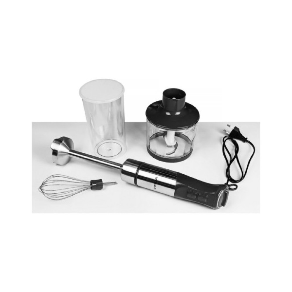 Блендер Grunhelm EBS-1102SS обладнаний різноманітними насадками — зокрема, насадкою-вінчиком, ножем для подрібнення і насадкою-блендером. Це дозволяє з легкістю змінювати види обробки продуктів відповідно до ваших потреб. Міні-подрібнювач з ємністю 500 мл здатен обробляти навіть найскладніші інгредієнти, роблячи його ідеальним вибором для занурення в кулінарну творчість.