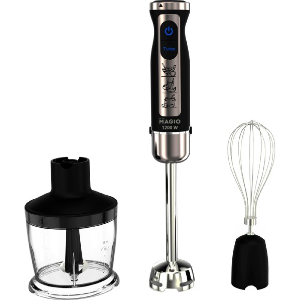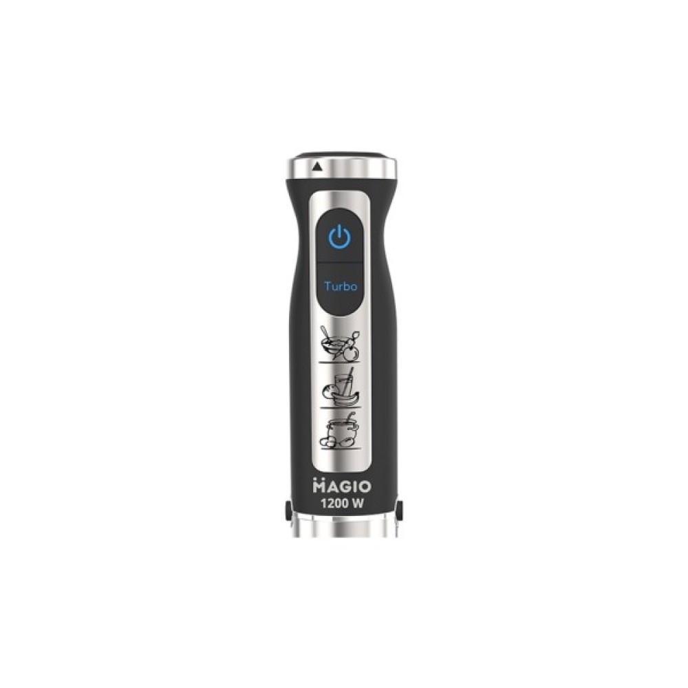 Блендер Magio MG-644 - ваш надійний партнер у кулінарних експериментах. Завдяки потужності 1200 Вт, цей занурювальний блендер виконує широкий спектр завдань - від простого змішування до подрібнення найтвердіших інгредієнтів, забезпечуючи безшумну та ефективну роботу. Висока надійність пристрою обумовлена використанням металевих компонентів: заглибна частина та ножі виготовлені з неіржавкої сталі, що гарантує стійкість до зношування та тривалий термін служби.