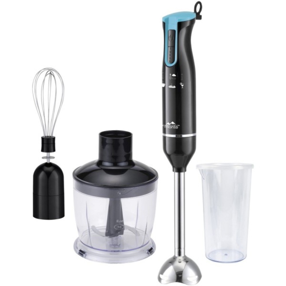 Monte MT-1905Т оснащений мірною склянкою об'ємом 0.6 л, яка робить процес змішування ще зручнішим та точнішим. Разом з блендером ви також отримуєте подрібнювач з ємністю 500 мл, що підходить для обробки овочів, фруктів та інших продуктів. Чопер і мірний стакан служать чудовим доповненням, що розширює можливості приготування страв.