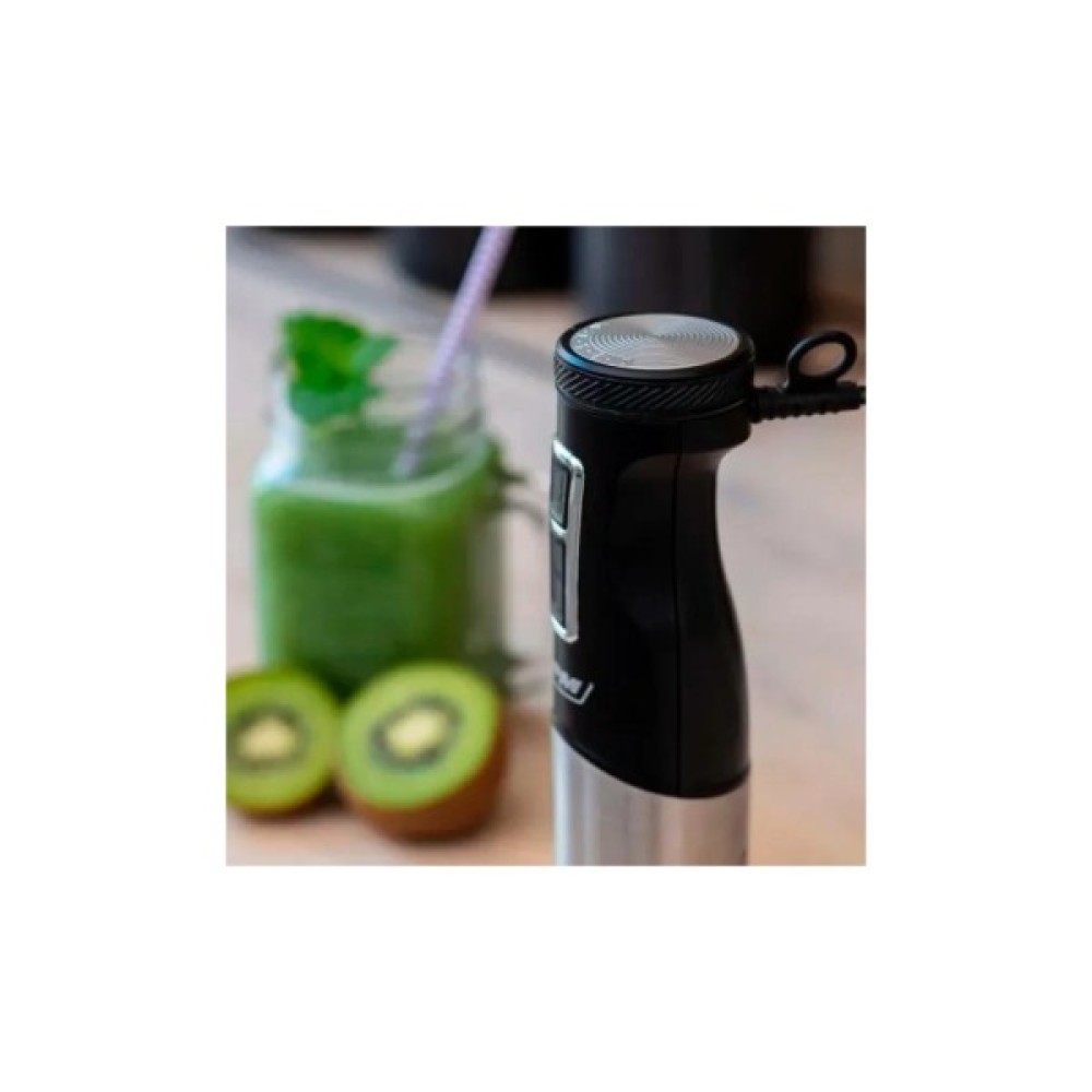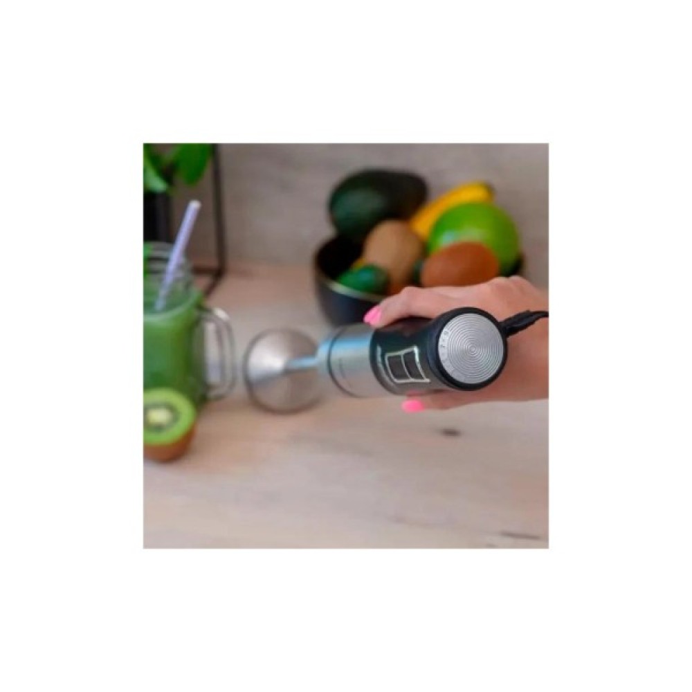 З потужністю у 1500 Вт, блендер MBL-33M легко справляється як із м’якими, так і з твердими продуктами, такими як заморожена полуниця чи горіхи. Особливу увагу варто звернути на 9-рівневе регулювання швидкості, яке дозволяє адаптувати потужність під конкретні кулінарні завдання. Зручне кільце у верхній частині ручки забезпечує легкий вибір швидкості, починаючи зі збивання на низьких обертах і поступовим збільшенням, щоб уникнути розбризкування. Для швидкого змішування або подрібнення заморожених інгредієнтів скористайтеся функцією турборежиму.