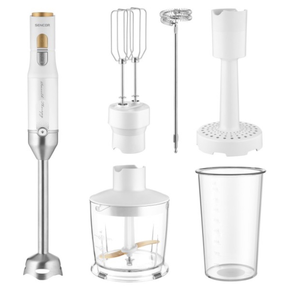 Однією з ключових переваг цього пристрою є його універсальність. Він оснащений не лише стандартною насадкою для блендера, а й набором додаткових накінечників: міксером, спінювачем молока, насадкою для пюре, ножем для подрібнення. Це дозволяє реалізувати всі ваші кулінарні фантазії, лише змінивши насадку. Завдяки функції подрібнювача з ємністю 500 мл можна швидко підготувати соуси, муси або перетерти горіхи. Перевага Sencor SHB6441WH також полягає в додаткових ємностях: мірний стакан на 0,8 літра та практичний чопер.