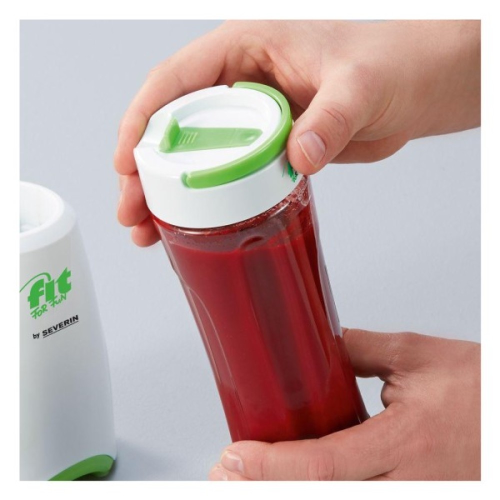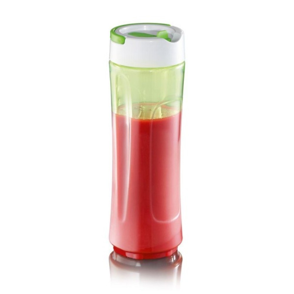 Цей блендер обладнаний мірною склянкою об’ємом 0.6 літра, що забезпечує достатню місткість для приготування порційних напоїв. В комплекті присутні 2 додаткові склянки з тритану, які не тільки міцні та легкі, але і безпечні для здоров'я, адже не містять BPA. Вони легко перетворюються у зручні пляшки для напоїв завдяки великій кришці та зручній формі.