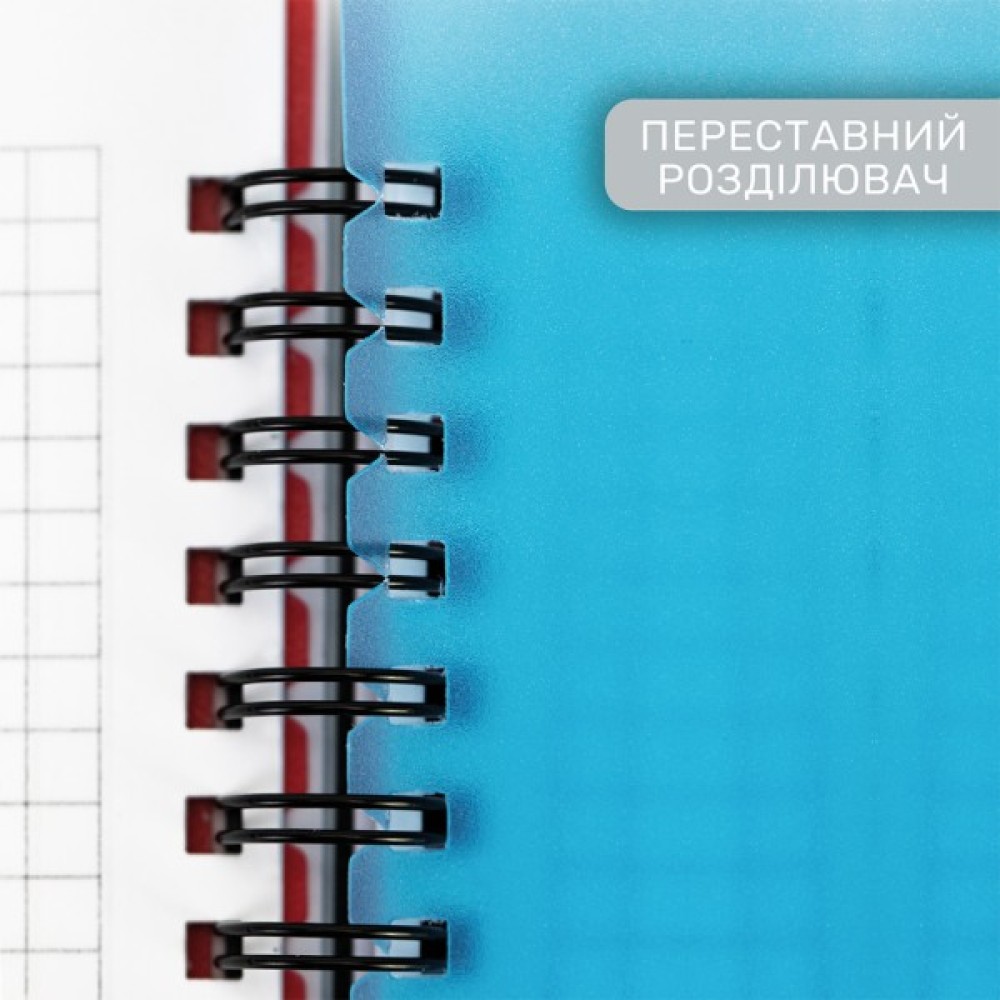 Блокнот формату B5 (170x205). Кріплення блока — спіраль. Обкладинка — пластик. Внутрішній блок — клітинка, цупкість паперу — 65 г/м², кількість аркушів — 120. З роздільниками блока. Вироблено в Україні.