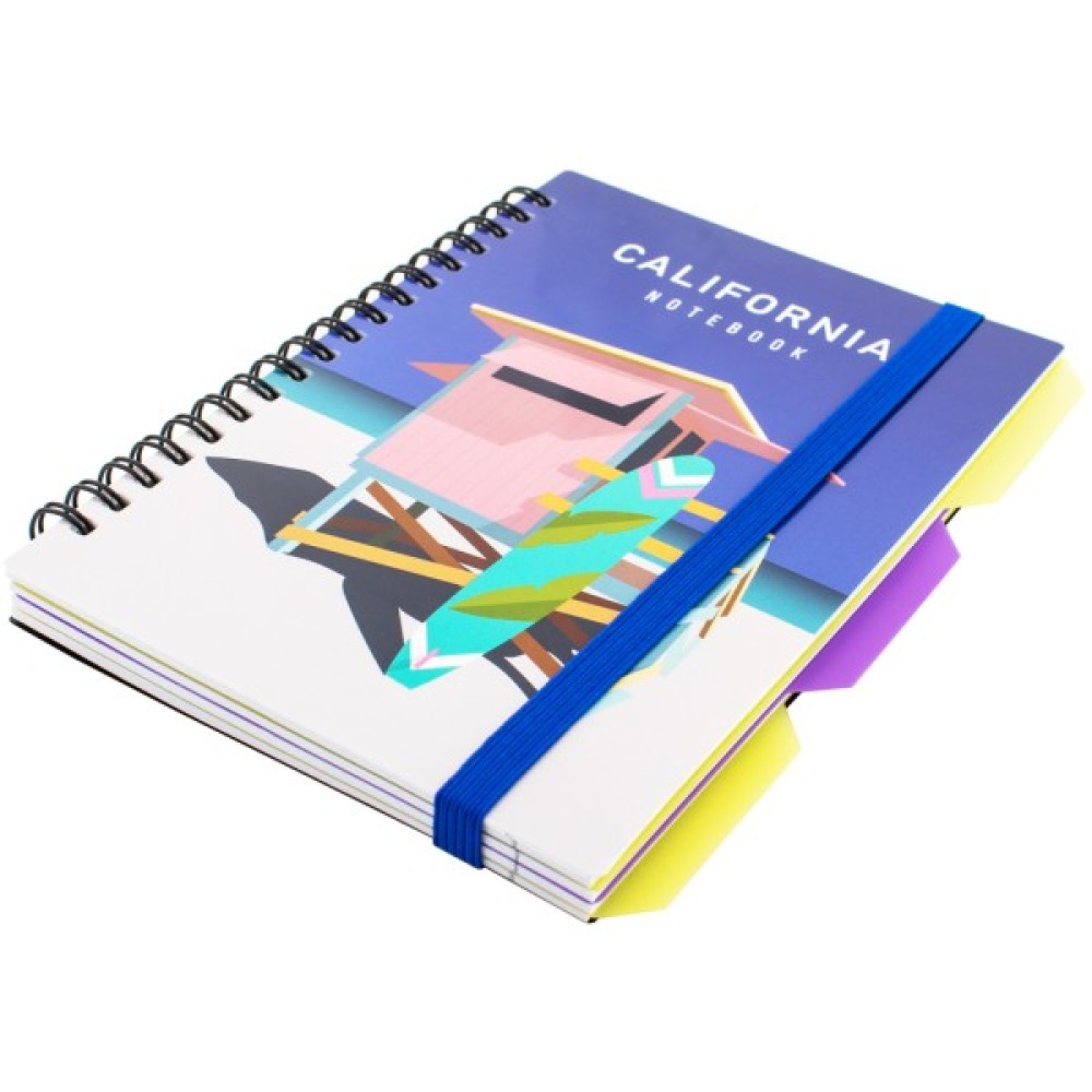 Блокнот формату B6 (122x177). Кріплення блока — спіраль. Обкладинка з гумкою, глянсовий пластик із повноколірним друком. Внутрішній блок — клітинка, щільність паперу — 65 г/м², кількість аркушів — 100. З переставними роздільниками блока.