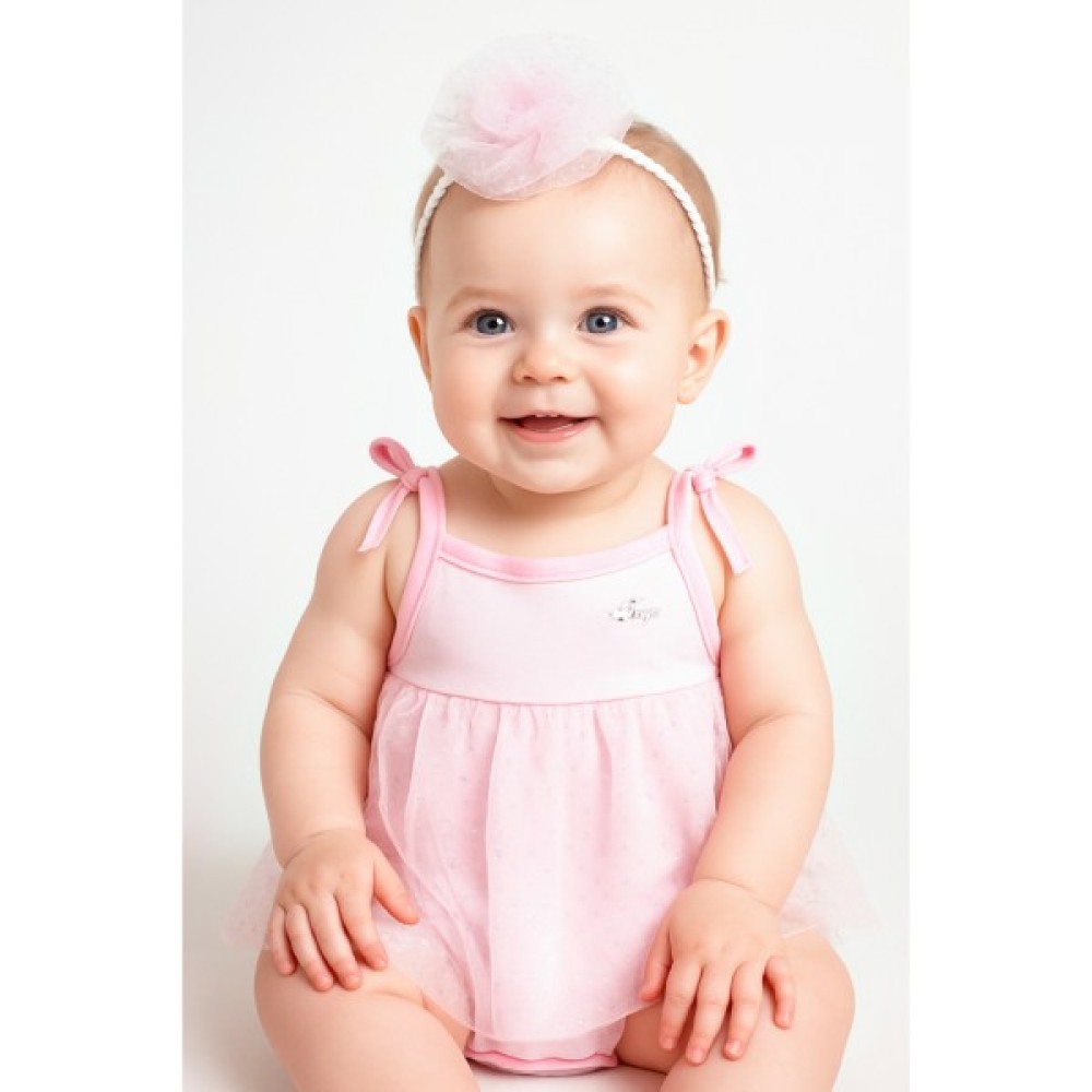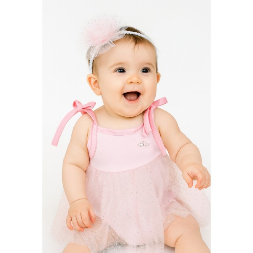 • Чарівний, блискучий, легенький боді-сарафан на зав'язочках, приємного рожевого кольору, з ніжним з'ємним квітковим декором для самої маленької красуні.