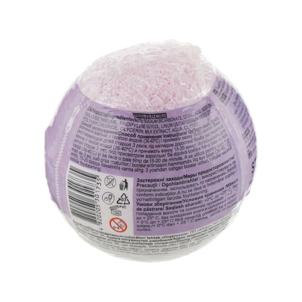 Склад Sodium bicarbonate, Citric acid, Sodium Chloride, Propylene Glycol, Paraffinum Liquidum, Parfum, Propylene glycol, Linum usitatissimum seed oil, Polyvinyl Chloride, Glycerin, Milk Extract, Aqua, СL 7707