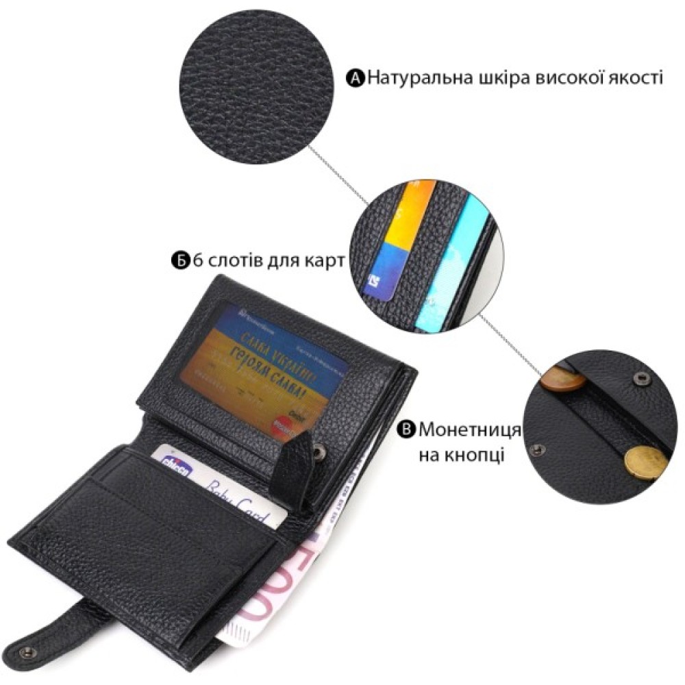 Закривається гаманець шкіряним хлястиком на кнопку.