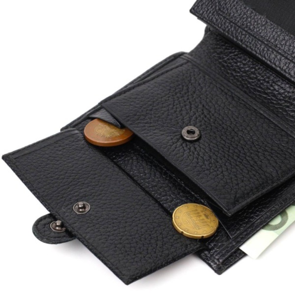 Виріб складається з двох відділень для купюр, шести осередків для кредиток, трьох прихованих кишень, монетниці та чотирьох відділень під сіткою під документи.