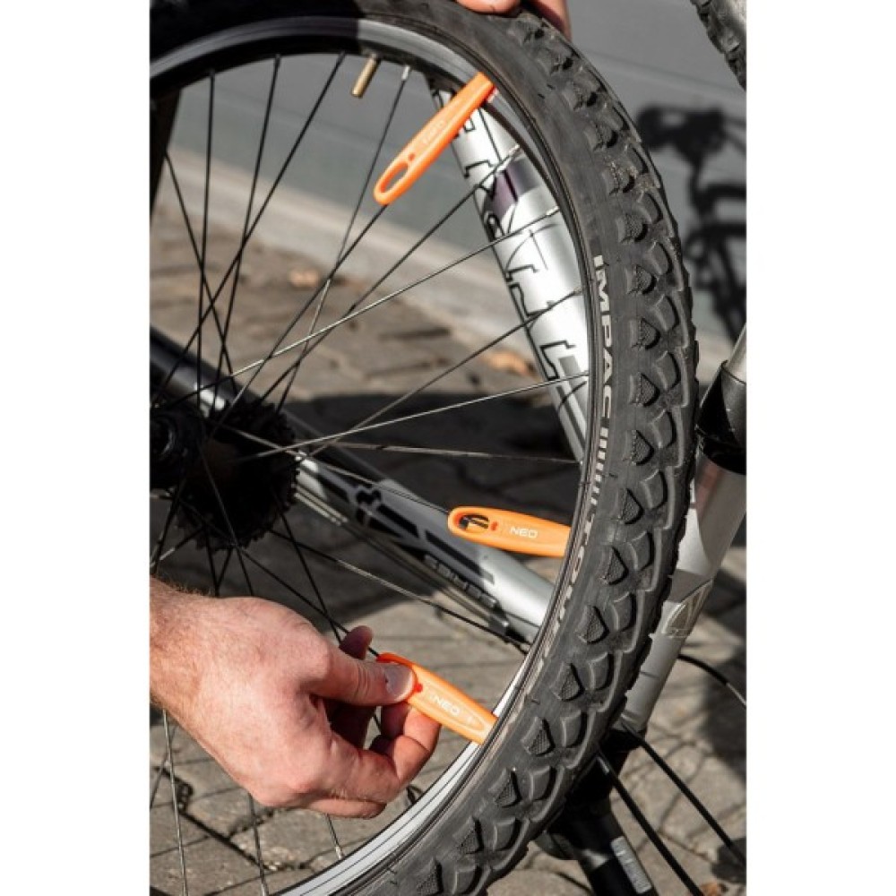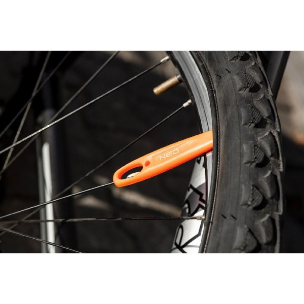 Лопатки бортувальні для велосипедних шин, Neo Tools 91-008 - це інструмент, що дозволяє зручно та ефективно проводити заміну шин та камер, не турбуючись про ризик пошкодження обода під час роботи. Лопатки фірмового помаранчевого кольору бренду Neo Tools є легкими та міцними. Виготовлені з міцного нейлону та мають довжину 10.5 см та ширину 12 мм. Вони мають ергономічну форму, що надійно лягає в руку. Добре мати їх завжди при собі на випадок надзвичайної ситуації. У комплекті 3 шт.