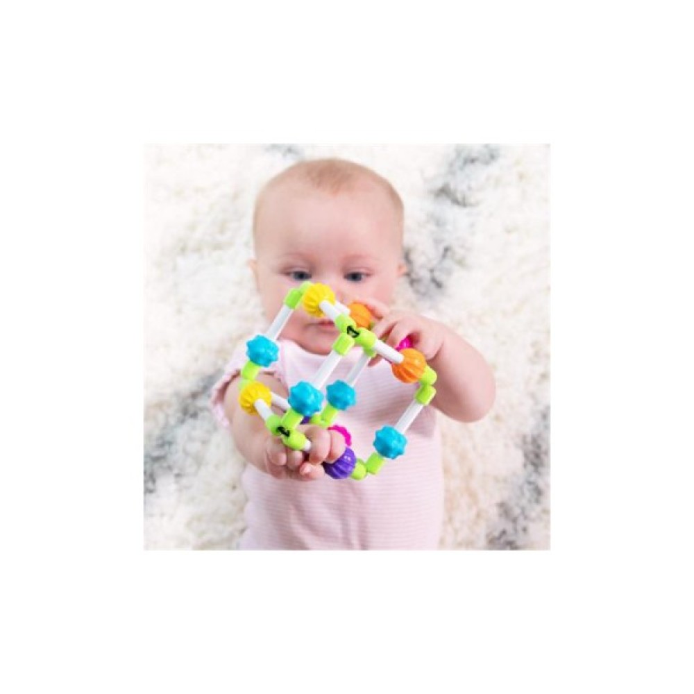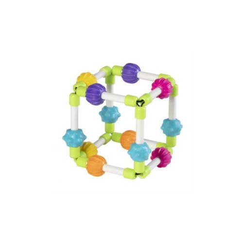 Усі грані кубика скріплені гумками, щоб маленькі ручки могли згинати і крутити іграшку. М'які рельєфні намистини на прорізувачі обертаються і ковзають, стимулюючи дотик малюка. Кубик можна сміливо пробувати на зуб. У такій барвистій і оригінальній іграшці малюкам є що досліджувати!