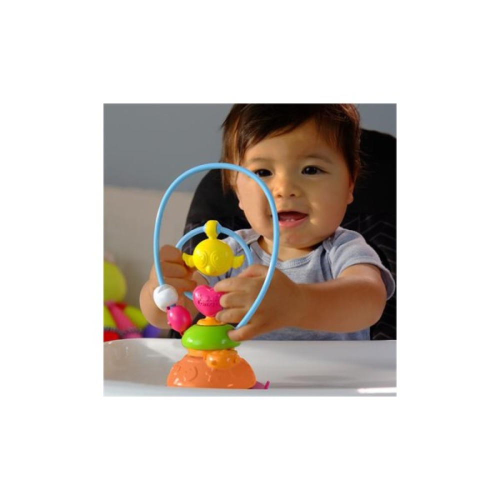 Основа на присосі утримує іграшку на місці, доки дитина грає. На верхній дузі є рухливі намистини, які допомагають розвивати дрібну моторику. На нижньому кільці висить сова, яку можна розгойдувати. Ще нижче розташовані барвисті тактильні елементи і деталь, яку можна крутити.