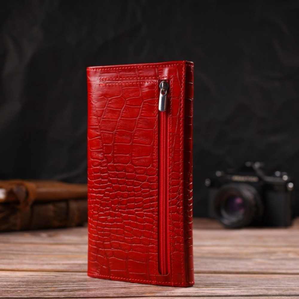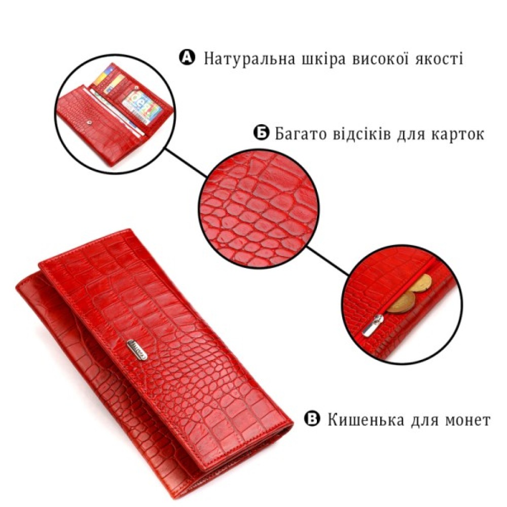 Чудовий фактурний жіночий гаманець горизонтального типу з натуральної шкіри із тисненням під крокодила. Аксесуар має одне основне відділення, шість кишень для карток (одна під сіточкою), одну приховану кишеню, три прилеглі кишені та монетницю. Закривається аксесуар клапаном на кнопку. Купуючи шкіряний аксесуар цієї фірми, собі чи на подарунок, будьте певні, що він прослужить Вам не один рік.