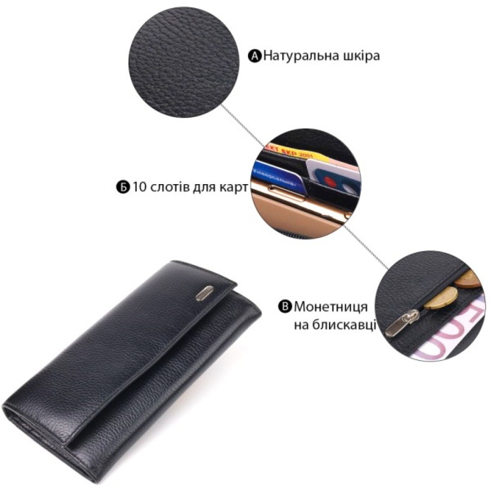 Аксесуар має два широкі основні відділення, в які поміщаються купюри всіх номіналів, кишеню-перегородку на блискавці, монетницю, десять кишень для карток, дві прилеглі кишені та одну приховану кишеню.