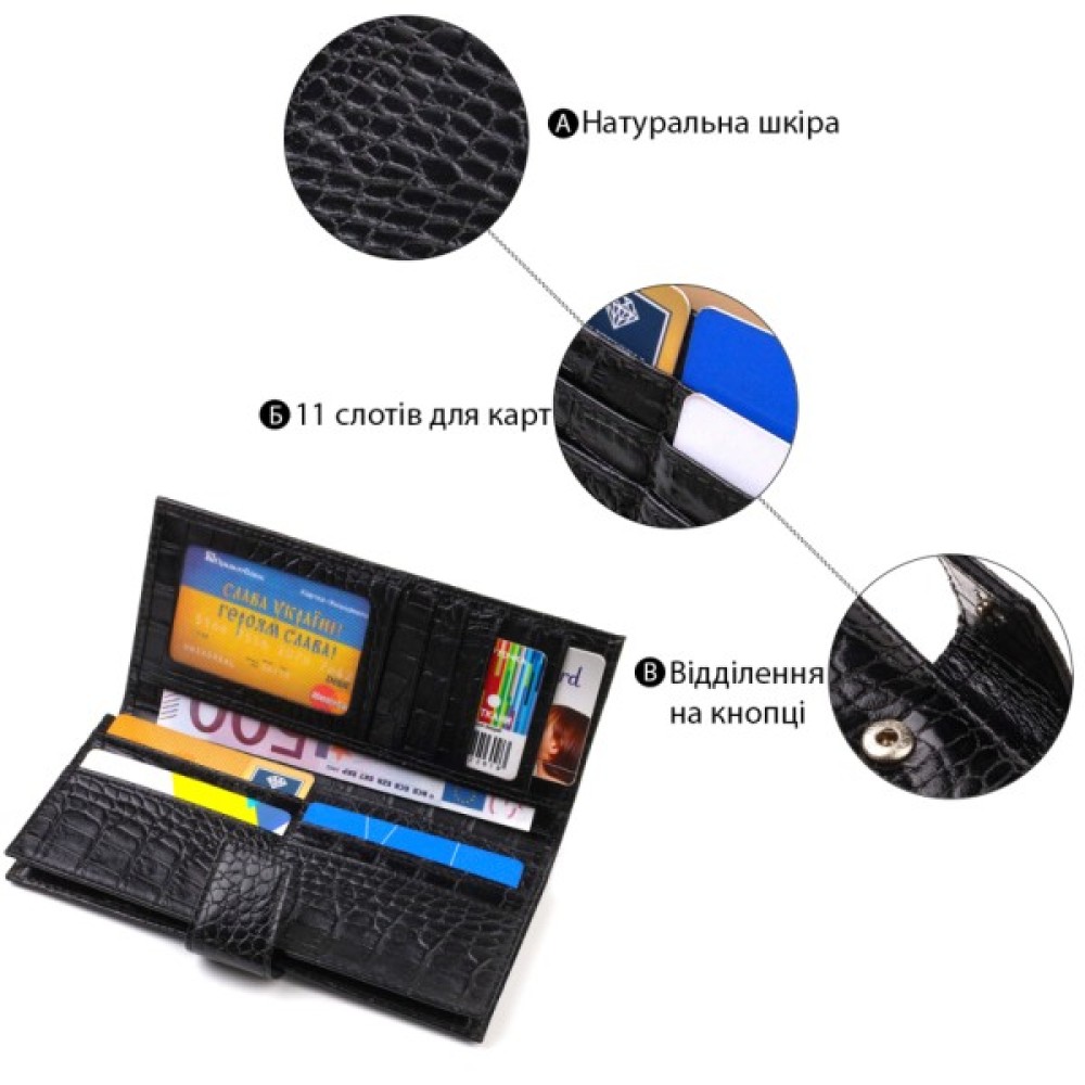 Аксесуар має одне основне відділення для купюр усіх номіналів, одинадцять осередків для карток, кишеню під сіточкою для пропуску та дві приховані кишені.