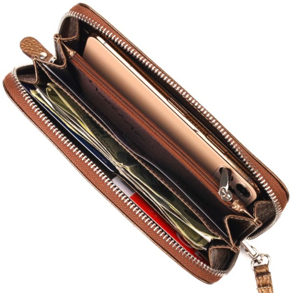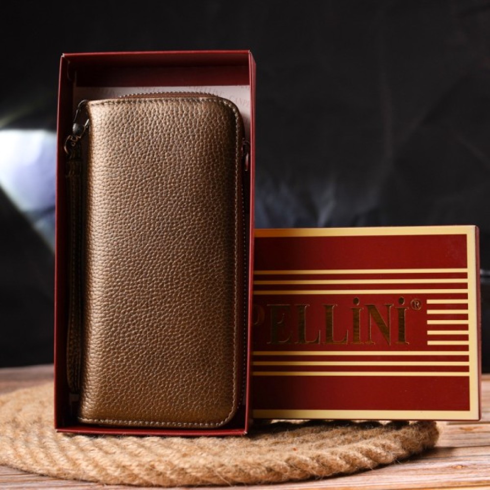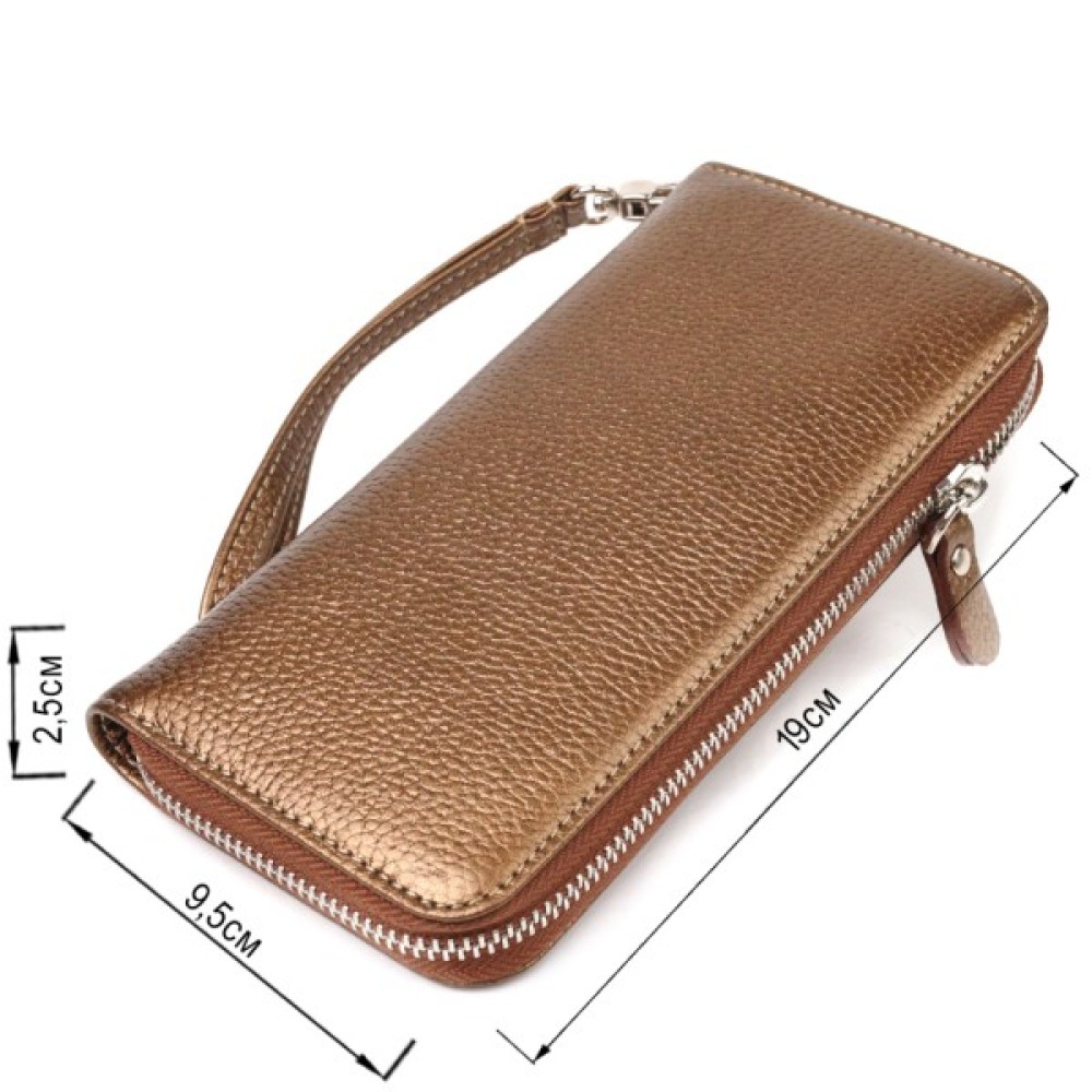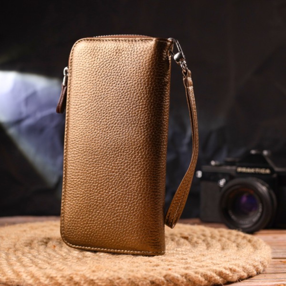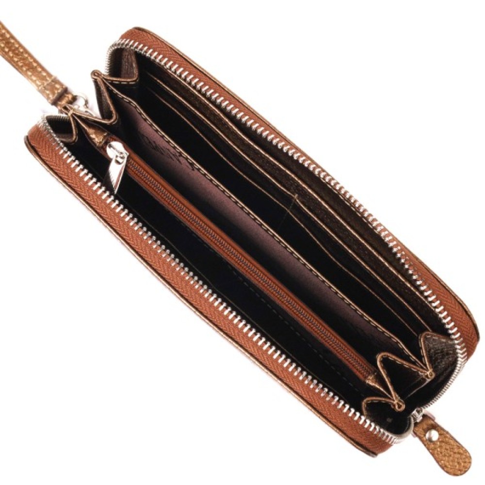 Дивовижний жіночий гаманець, з натуральної шкіри коричневого кольору з ледь вловимим золотавим блиском. Аксесуар має три основні відділення, в які поміщаються купюри всіх номіналів, дві перегородки, одна з них на блискавці, вісім кишень для карток, дві прилеглі кишені та знімний кистьовий ремінь.