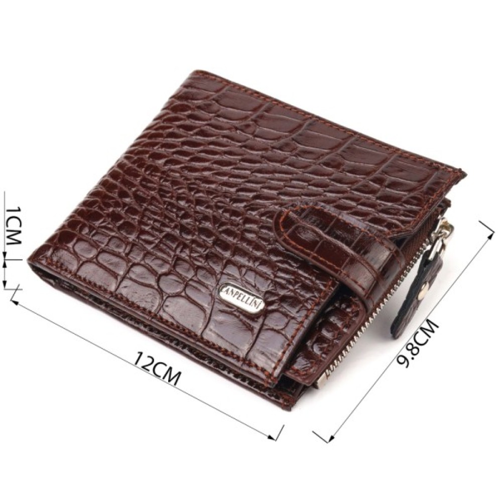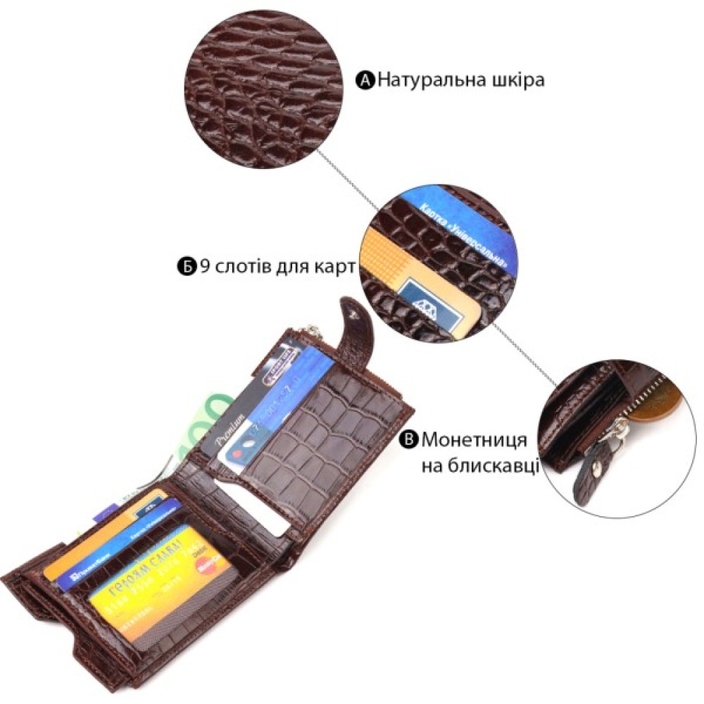 Функціональний гаманець для чоловіків з натуральної фактурної шкіри з тисненням під крокодила. Аксесуар має одне основне відділення з перегородкою, до якого вміщуються купюри всіх номіналів, дев'ять кишень для карток, дві з яких під сіточкою, монетницю на блискавці, п’ять прилеглих кишень, а також автономний блок для карт, який розташований в одній із прилеглих кишень. Закривається аксесуар хлястиком на кнопку. Колір фурнітури – срібло.