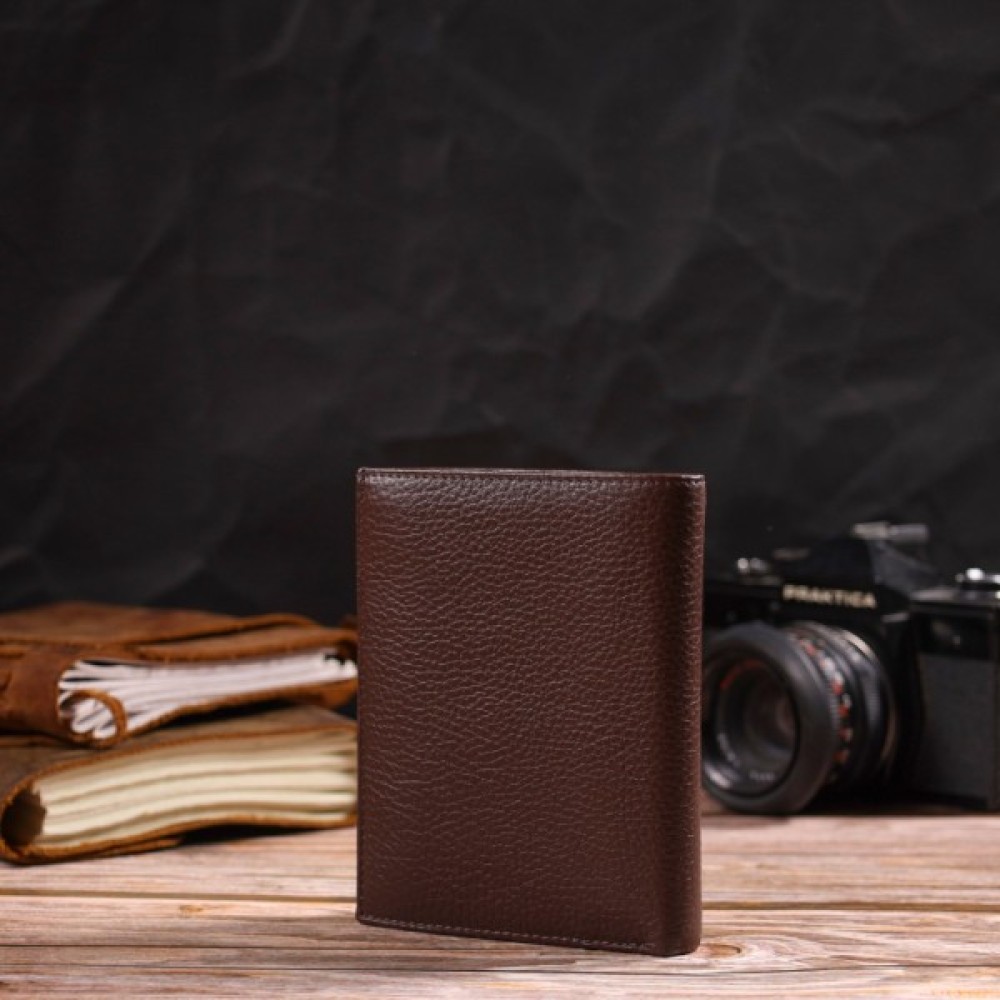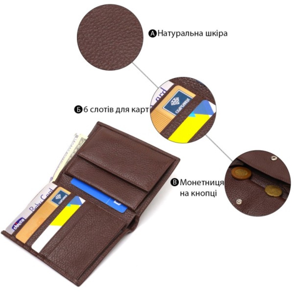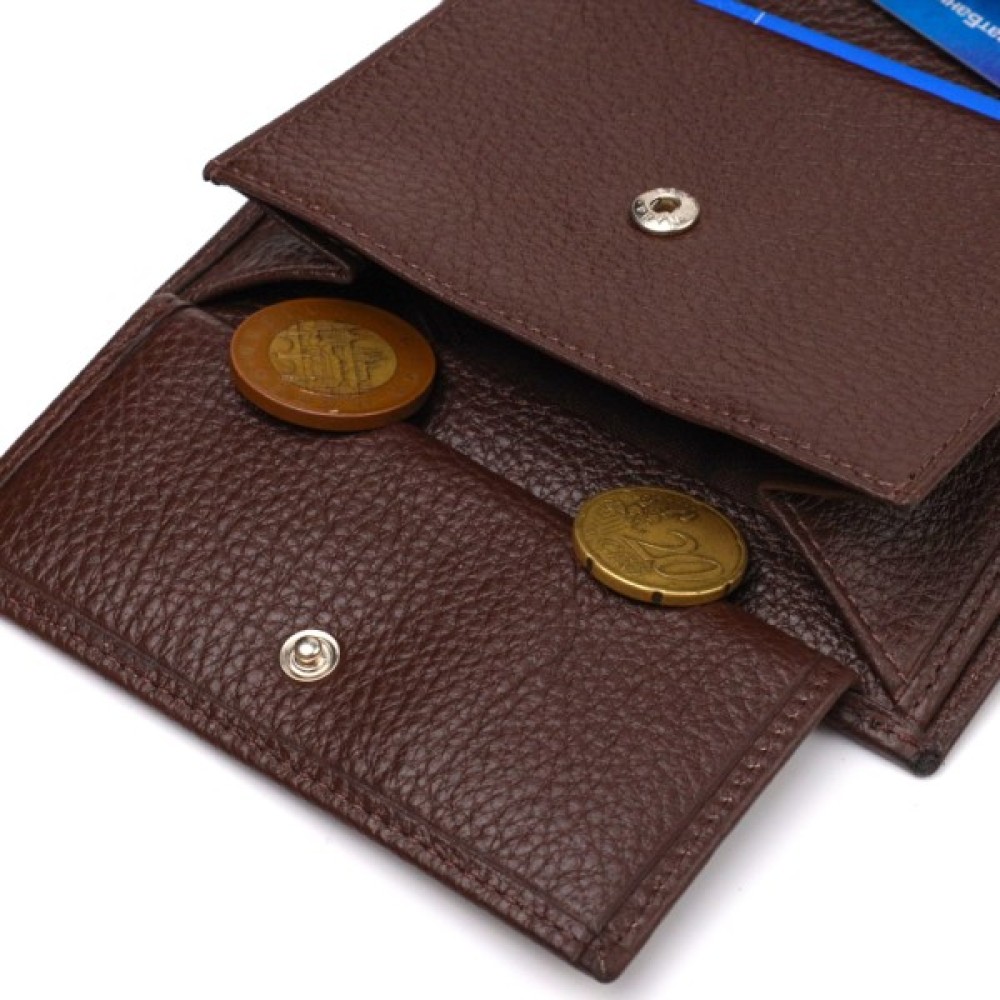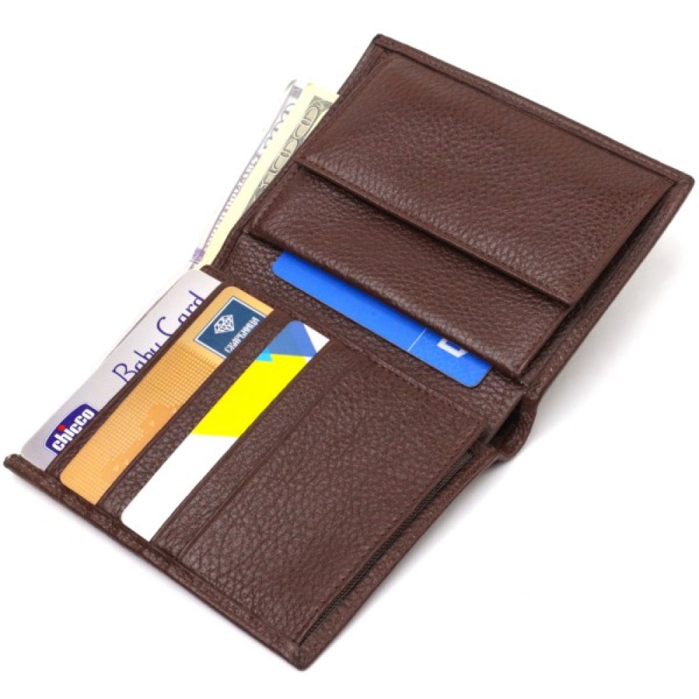 Стильний і красивий чоловічий гаманець у коричневому кольорі з натуральної шкіри. Аксесуар має одне основне відділення з перегородкою, в яке поміщаються купюри всіх номіналів, шість кишень для карток, дві кишені під сіточкою для документів, монетницю та одну прилеглу кишеню.