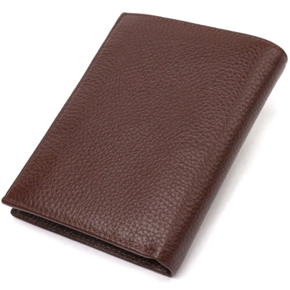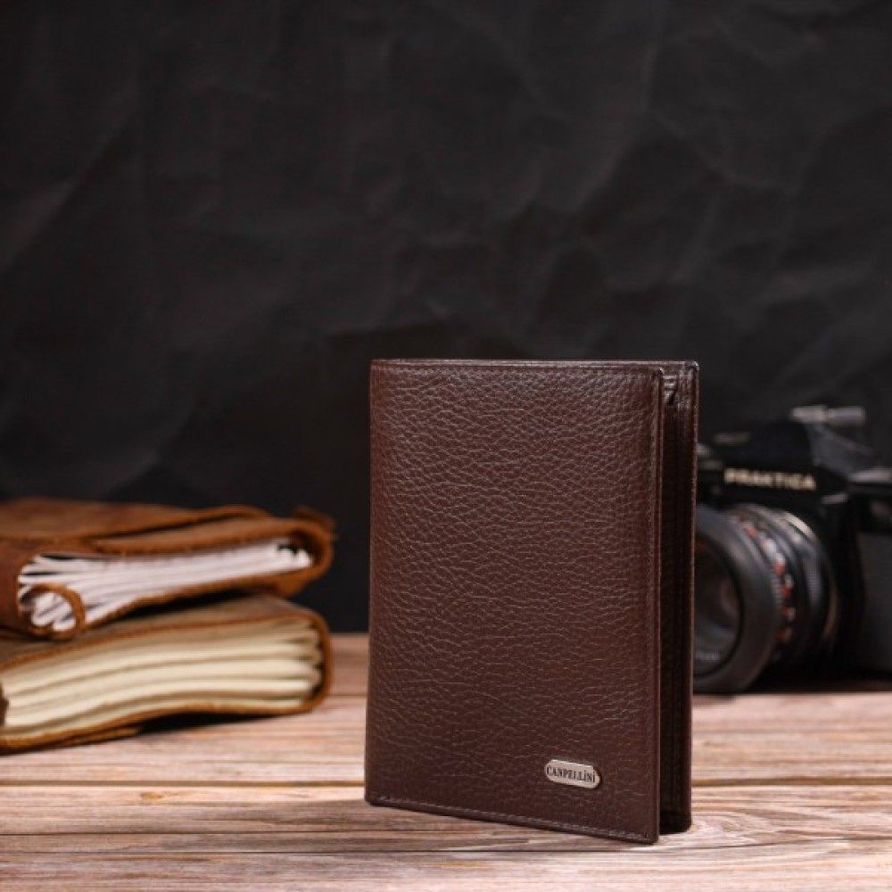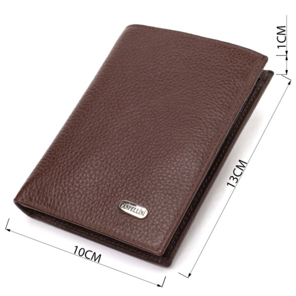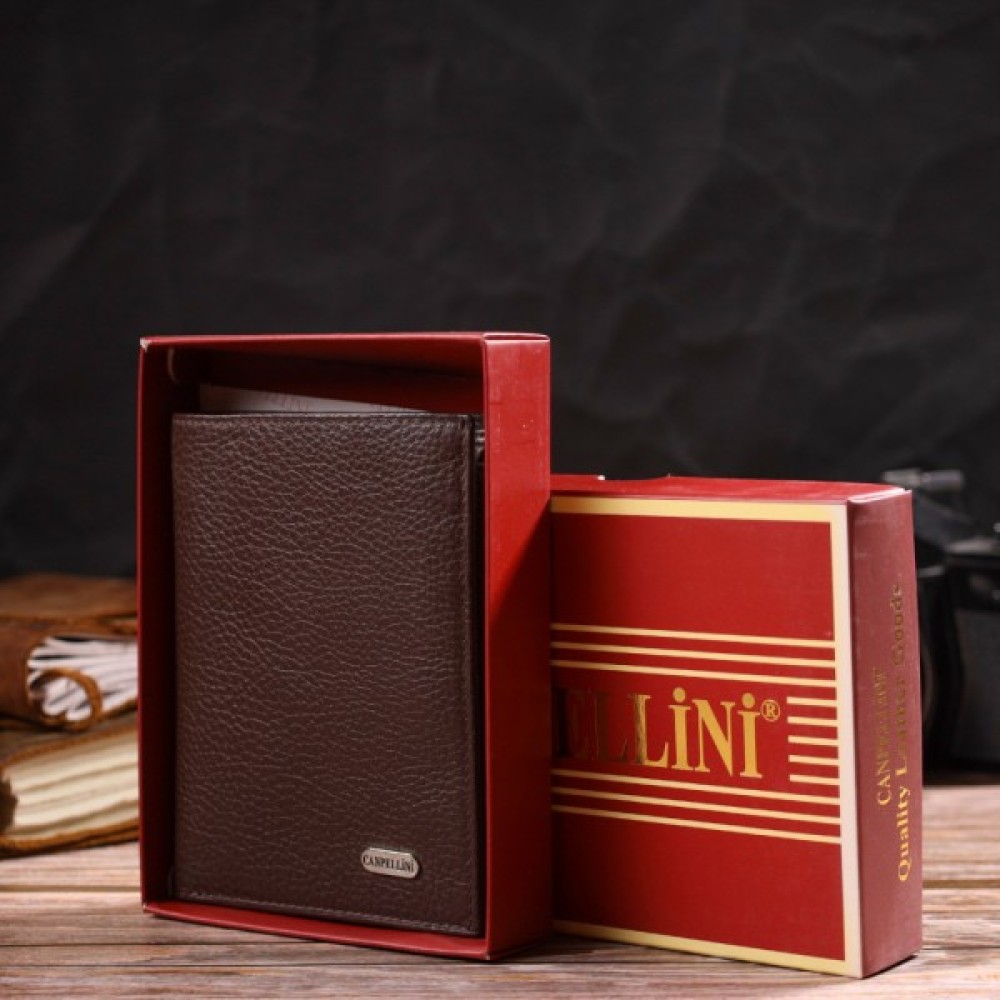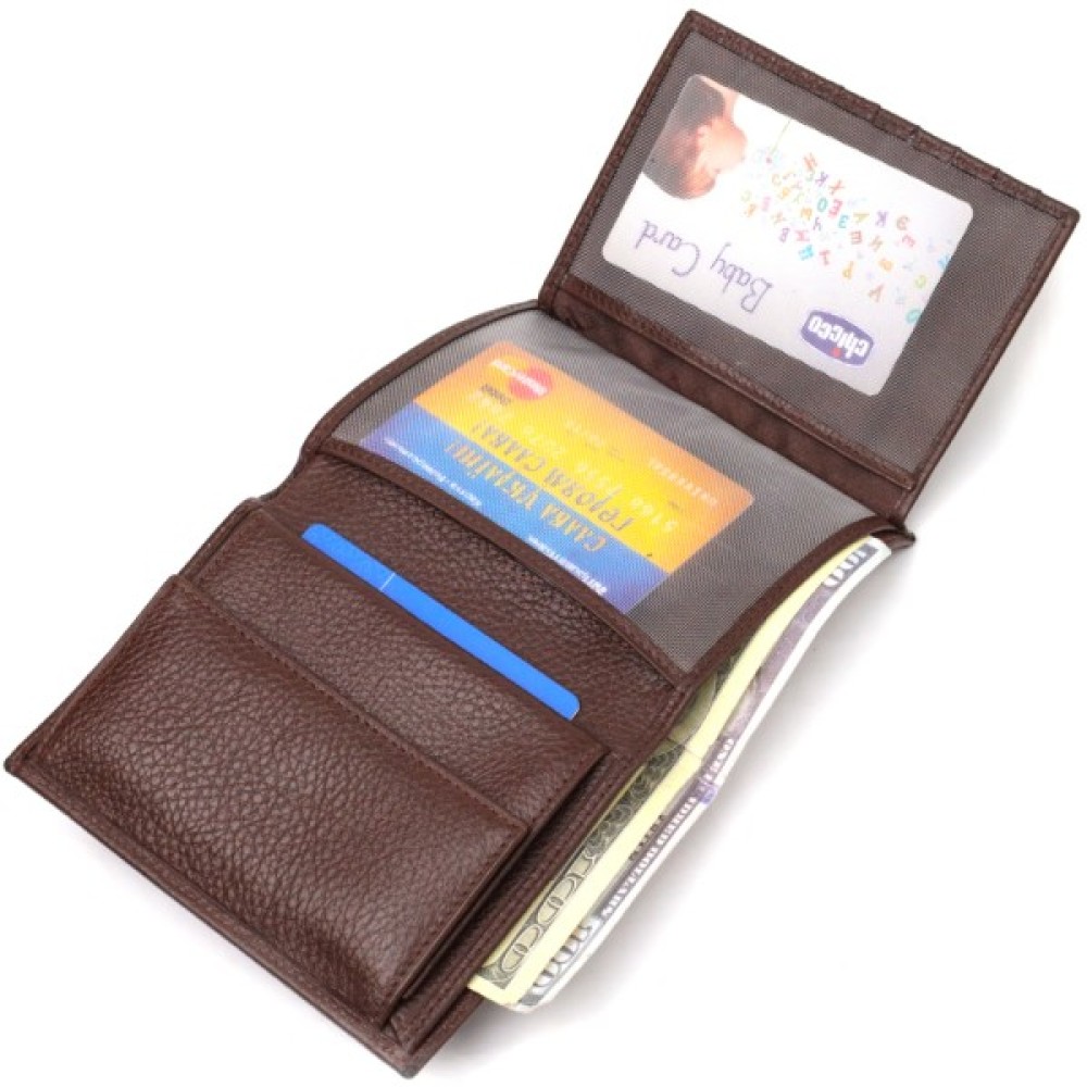 Стильний і красивий чоловічий гаманець у коричневому кольорі з натуральної шкіри. Аксесуар має одне основне відділення з перегородкою, в яке поміщаються купюри всіх номіналів, шість кишень для карток, дві кишені під сіточкою для документів, монетницю та одну прилеглу кишеню.