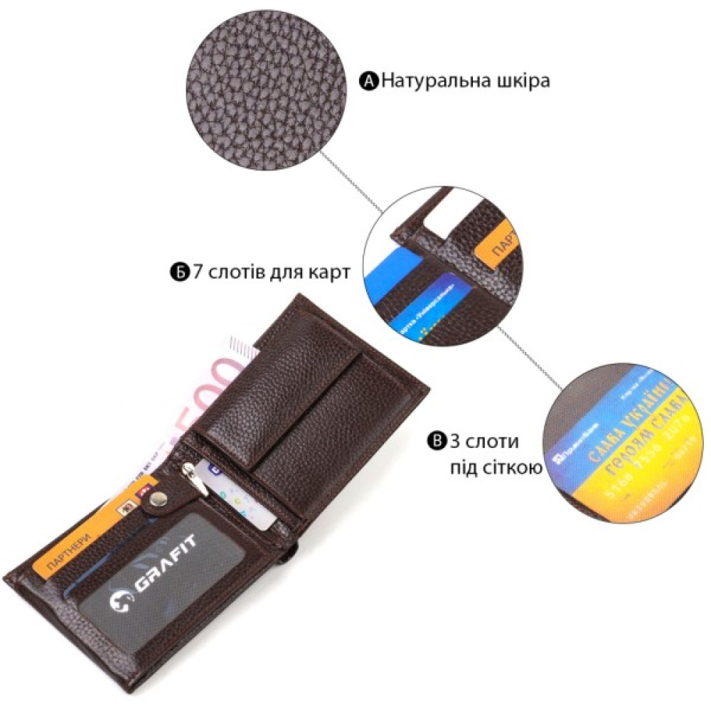 Аксесуар має основне відділення для купюр з перегородкою, сім осередків для карток, три кишені під сіткою для пропусків, два приховані кишені та кишеню на блискавці.