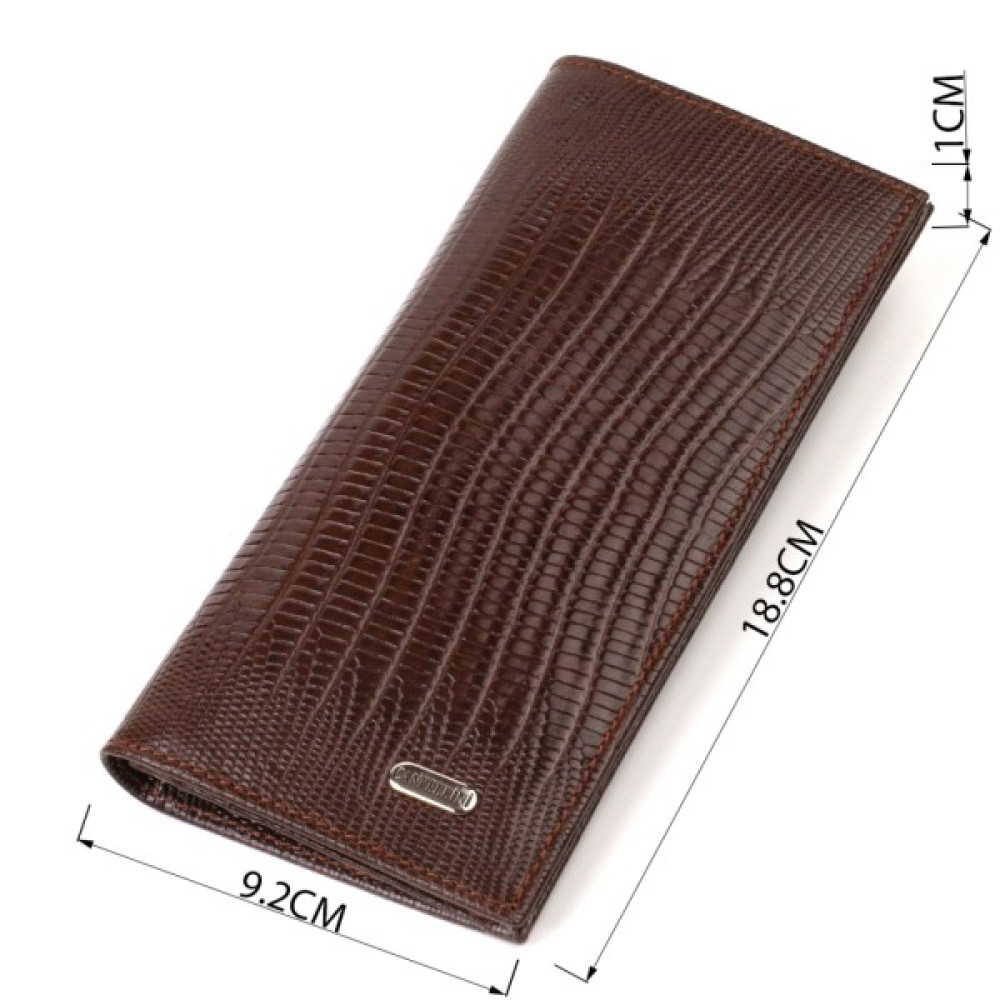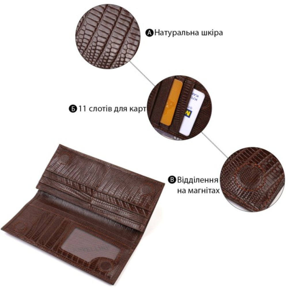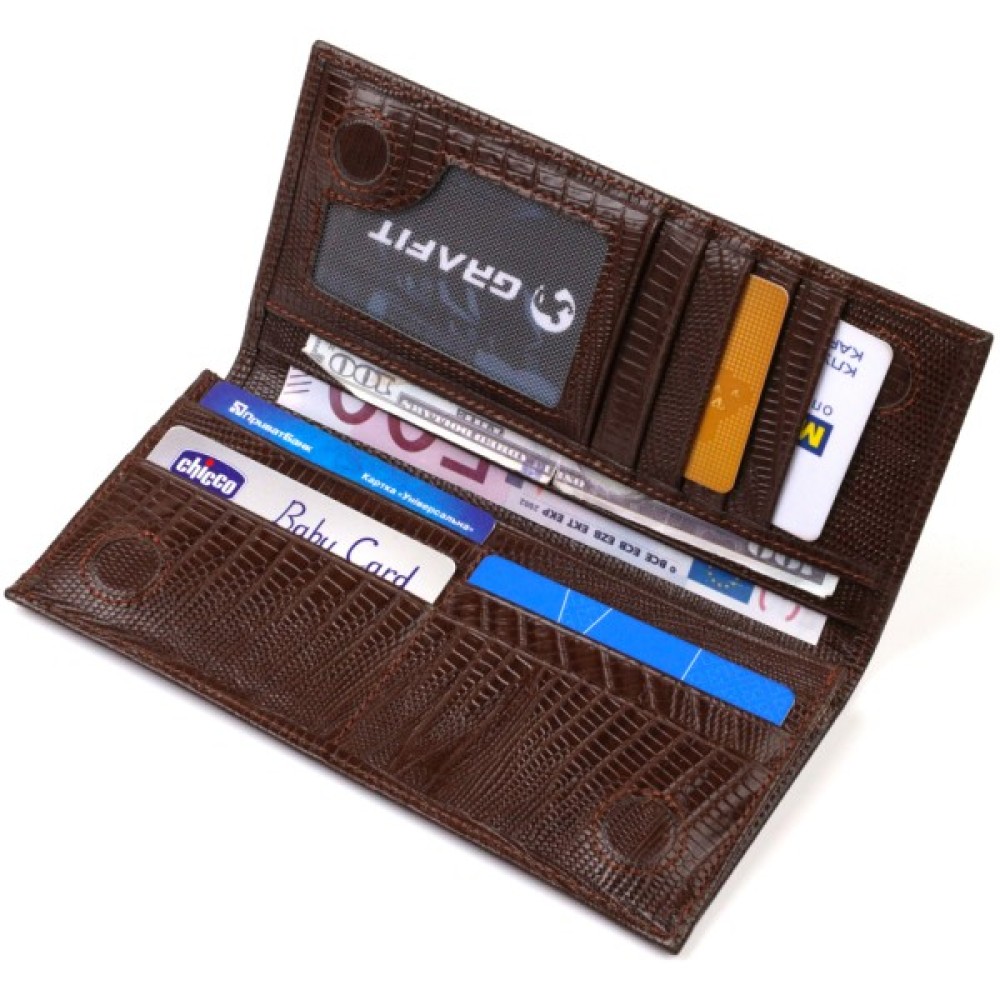 Аксесуар має одне основне відділення для купюр усіх номіналів, одинадцять осередків для карток, кишеню під сіточкою для пропуску, дві приховані кишені та монетницю на блискавці.